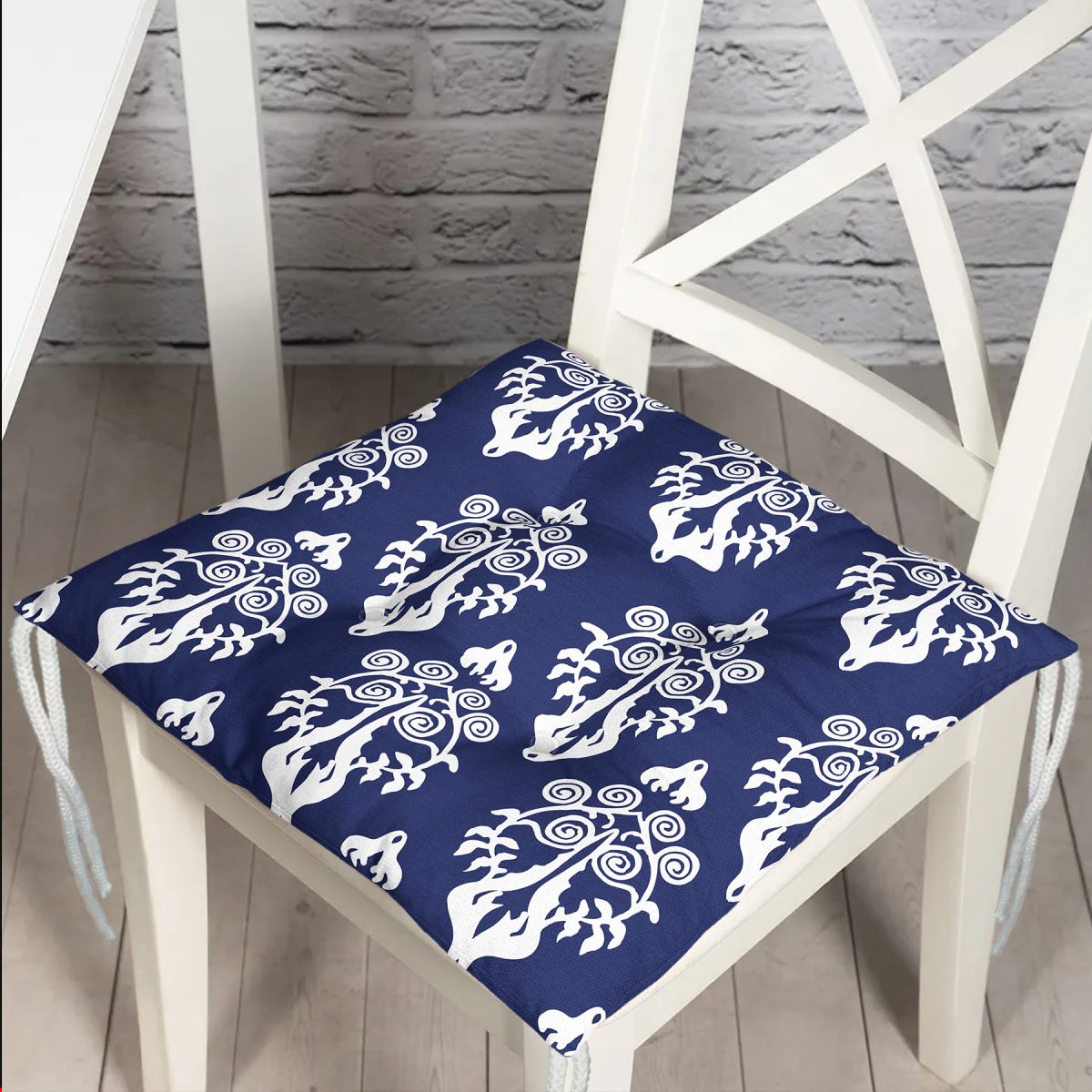 Lacivert Zemin Beyaz Damask Tasarımlı Pofuduk Sandalye Minderi