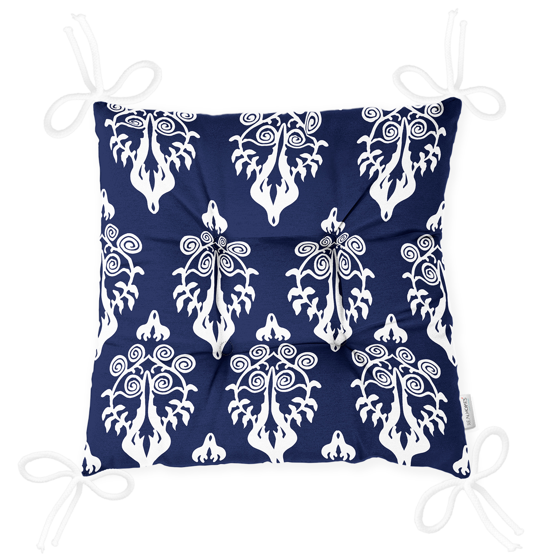 Lacivert Zemin Beyaz Damask Tasarımlı Pofuduk Sandalye Minderi Realhomes