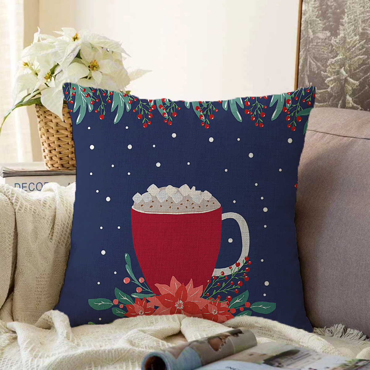 Lacivert Zemin Kırmızı Bardak Desenli Dijital Baskılı Modern Raşel Kadife Yastık Kırlent Kılıfı