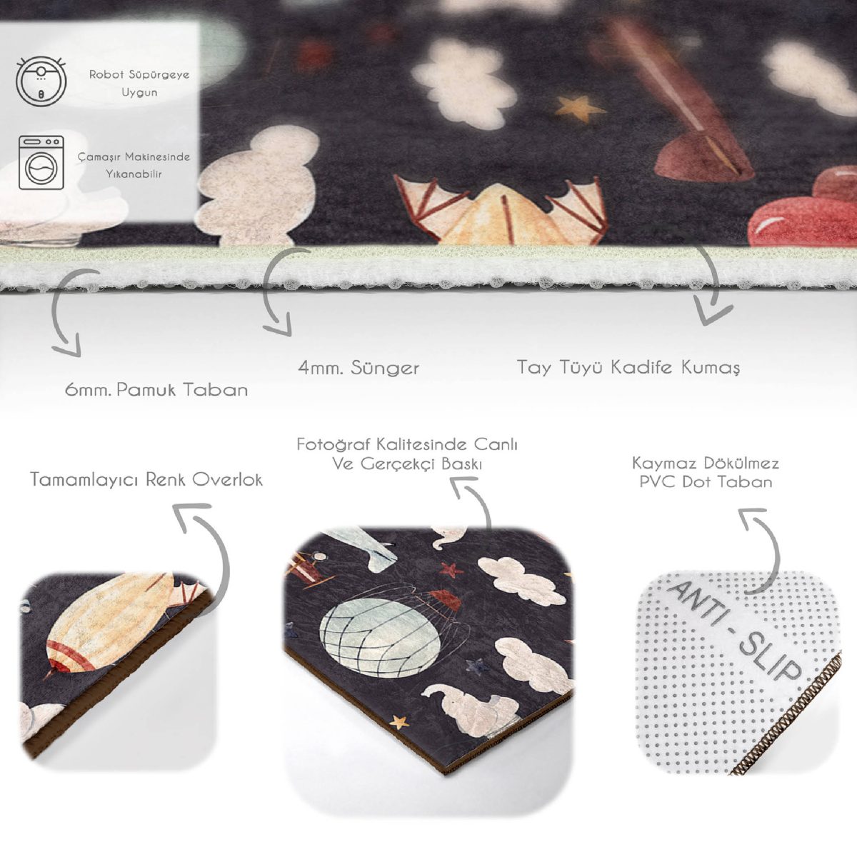Lacivert Zemin Uçak Balon Temalı Çocuk & Genç Odası Makinede Yıkanabilir Kaymaz Tabanlı Dikdörtgen Özel Ölçü Çocuk Odası Halısı