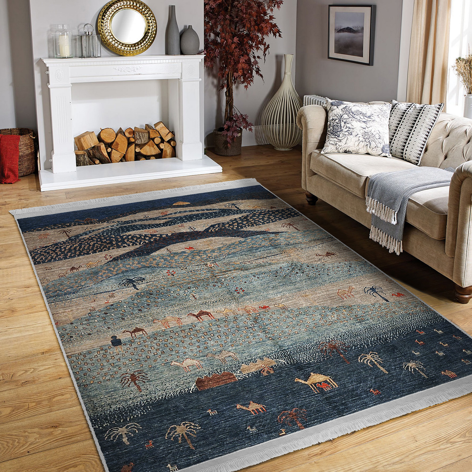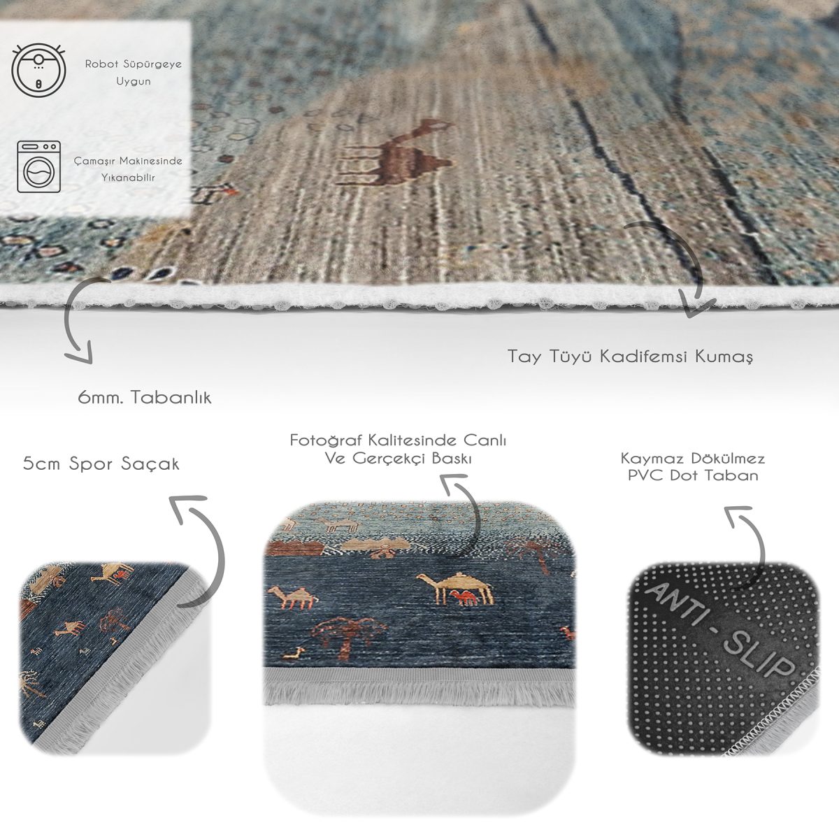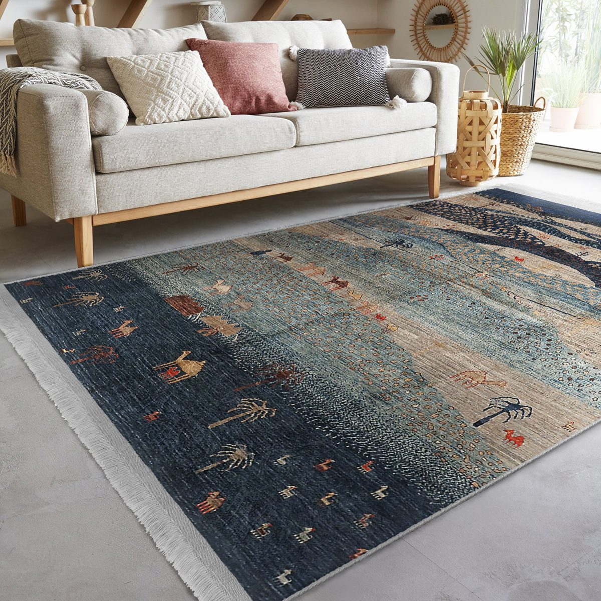 Lacivert Zeminde Antik Motifli Geleneksel Desenli Vintage Etnik Motifler Salon & Oturma Odası Dış Mekan & Outdoor Dijital Baskılı Makinede Yıkanabilir Kaymaz Taban Saçaklı Halı
