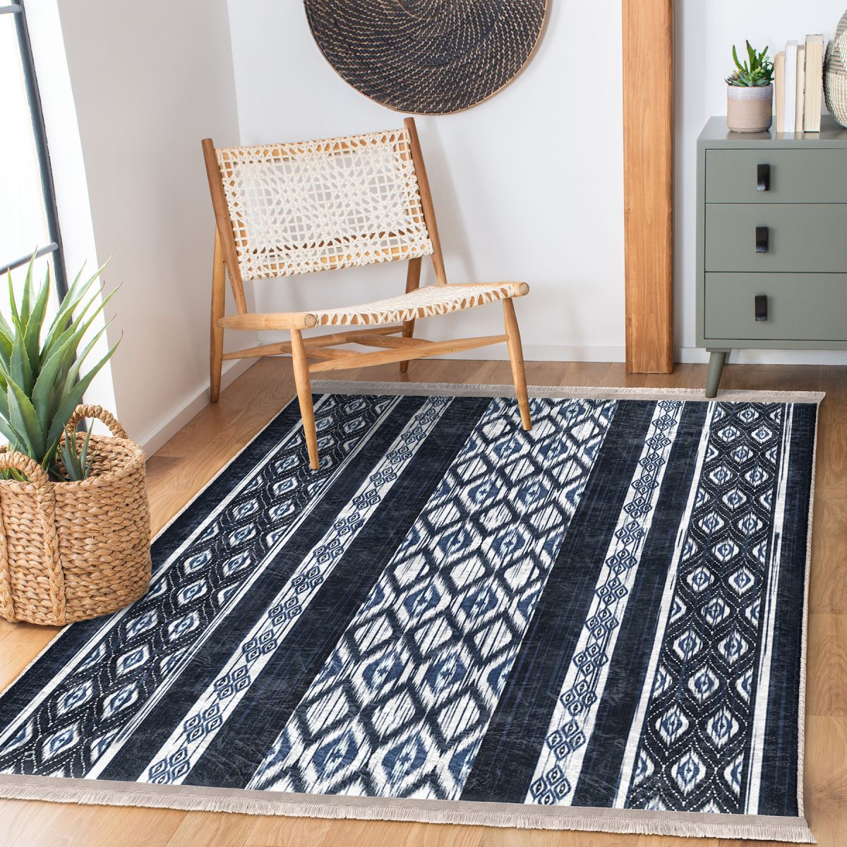 Lacivert Zeminde Etnik Motifli Kilim Desenli Vintage Etnik Motifler Koridor & Antre Ofis Dijital Baskılı Makinede Yıkanabilir Kaymaz Taban Saçaklı Halı