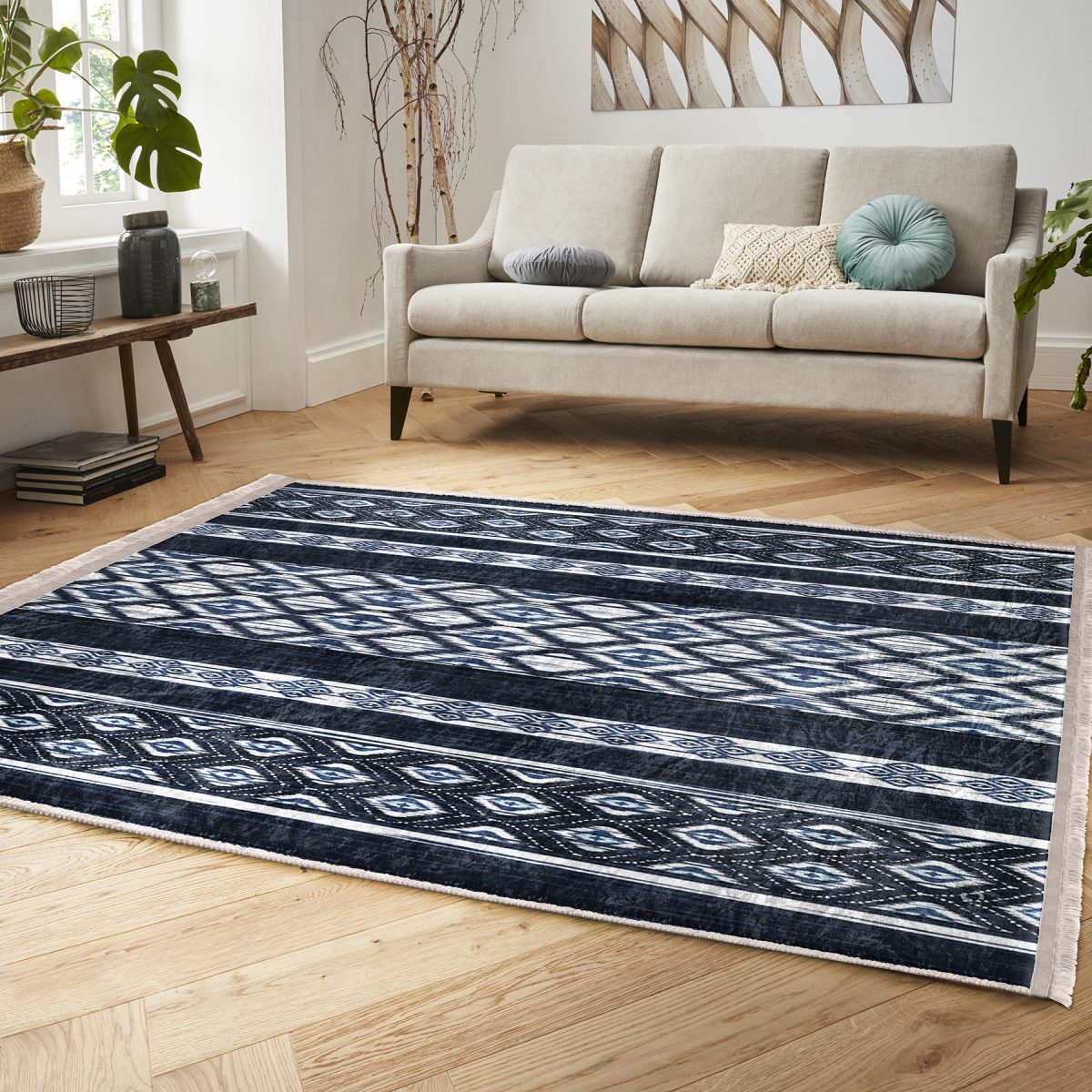 Lacivert Zeminde Kilim Motifli Baklava Desenli Etnik Motifler Vintage Salon & Oturma Odası Koridor & Antre Dijital Baskılı Makinede Yıkanabilir Kaymaz Taban Saçaklı Halı