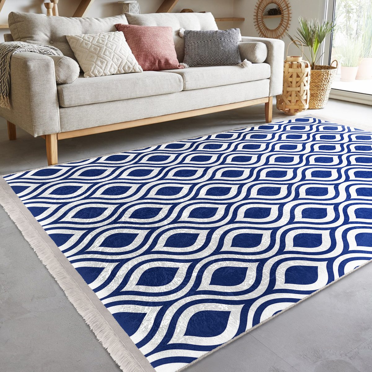 RealHomes Dijital Baskılı Kaymaz Tabanlı Deluxe Halılar, kumaş seçimi ve püsküllü dikiş detaylarıyla şık bir dekorasyon öğesi olarak kullanımınıza sunulmaktadır. Her bir desen RealHomes tasarımcıları tarafından özenle tasarlanmış ve satışa sunulmuştur. Fotoğraf kalitesinde canlı ve gerçekçi baskılarımız yıkamaya ve kullanıma bağlı olarak solma yapmaz, yıllar boyu ilk günkü özelliğini korur.