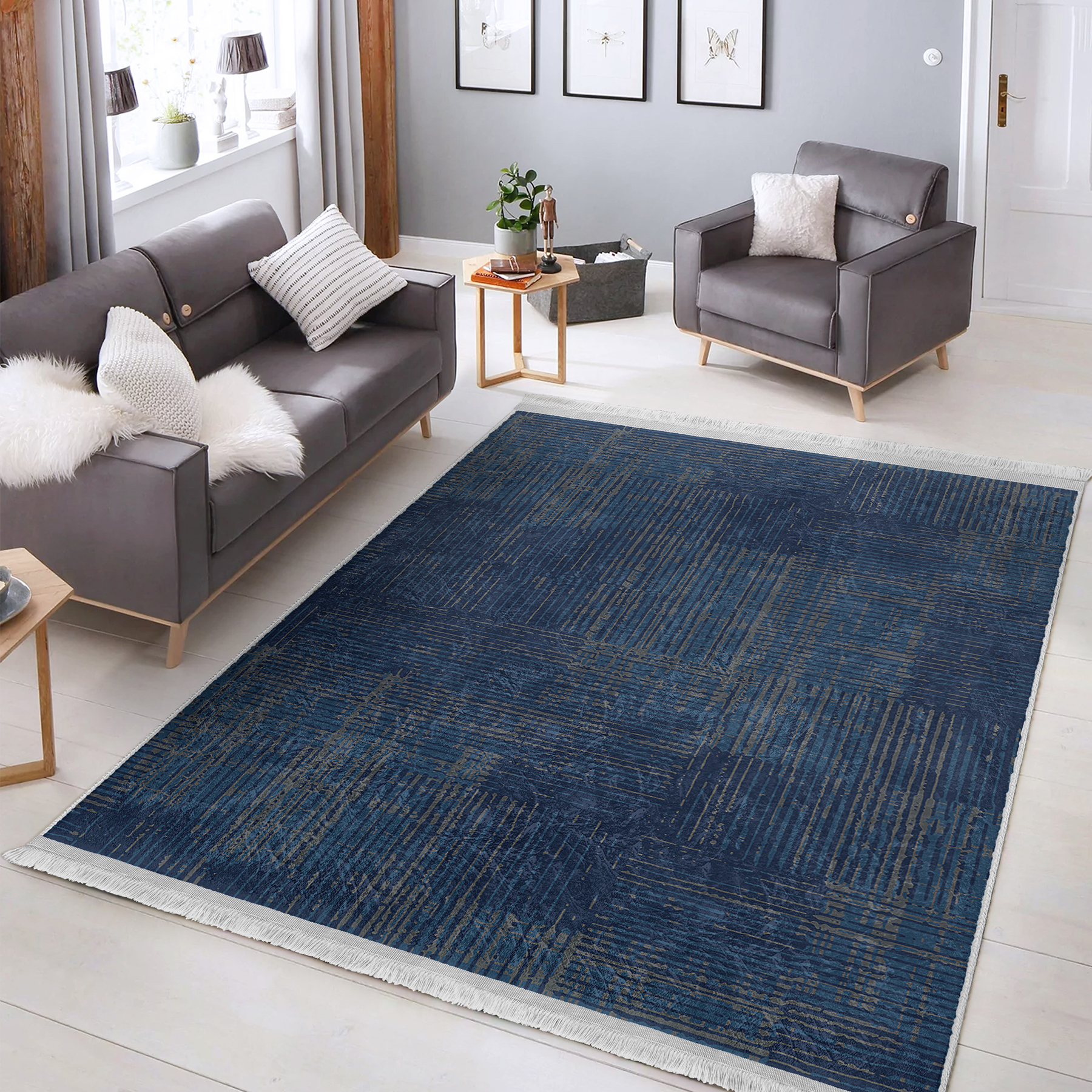 Lacivert Zeminde Örgü Motifli Kilim Desenli Geometrik Eskitme Motifli Koridor & Antre Salon & Oturma Odası Dijital Baskılı Makinede Yıkanabilir Kaymaz Taban Saçaklı Halı