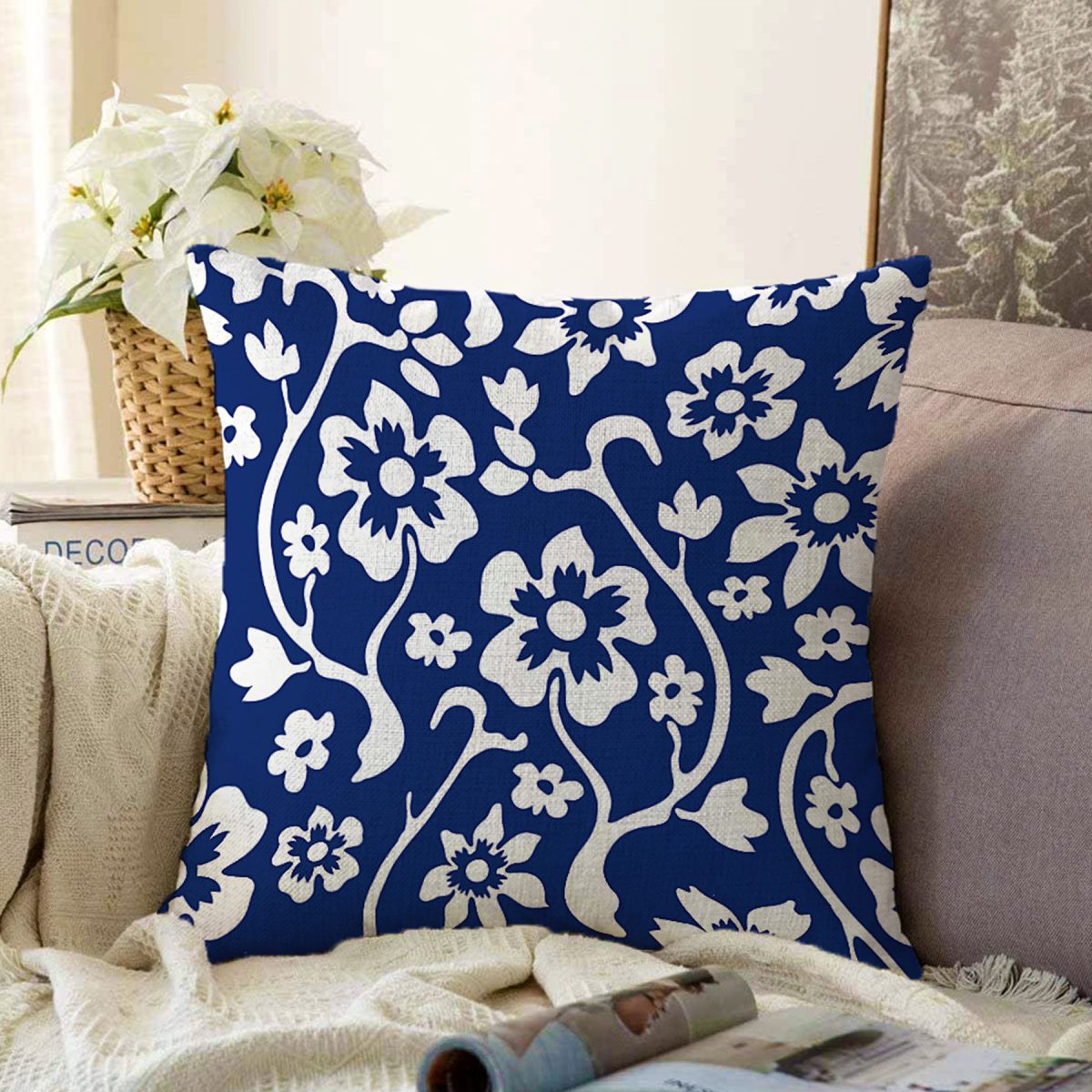 Lacivert Zeminli Beyaz Tropik Yaprak Motifli Raşel Kadife Yastık Kırlent Kılıfı