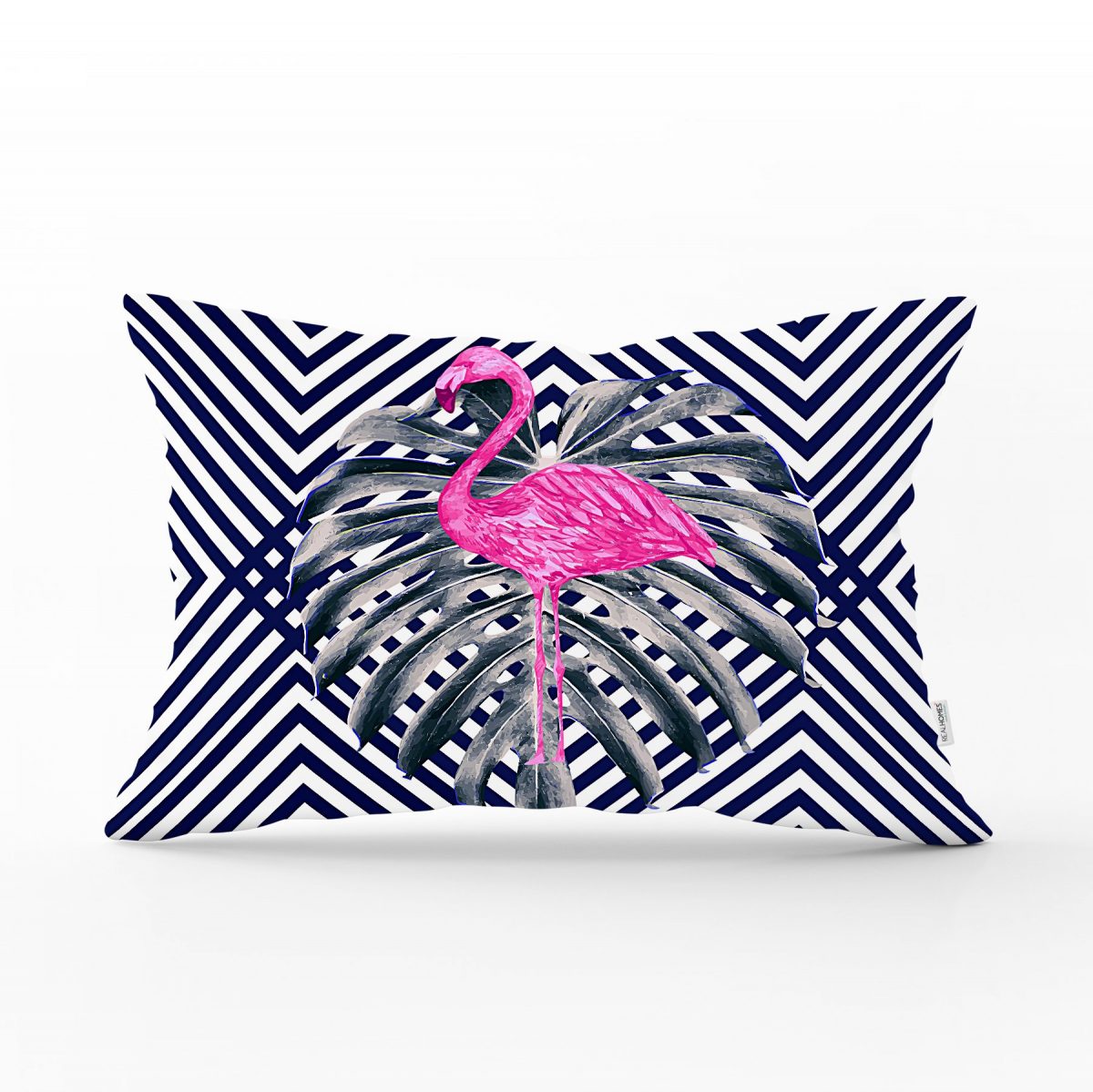 Lacivert Zeminli Flamingo Desenli Dijital Baskılı Dikdörtgen Kırlent Kılıfı