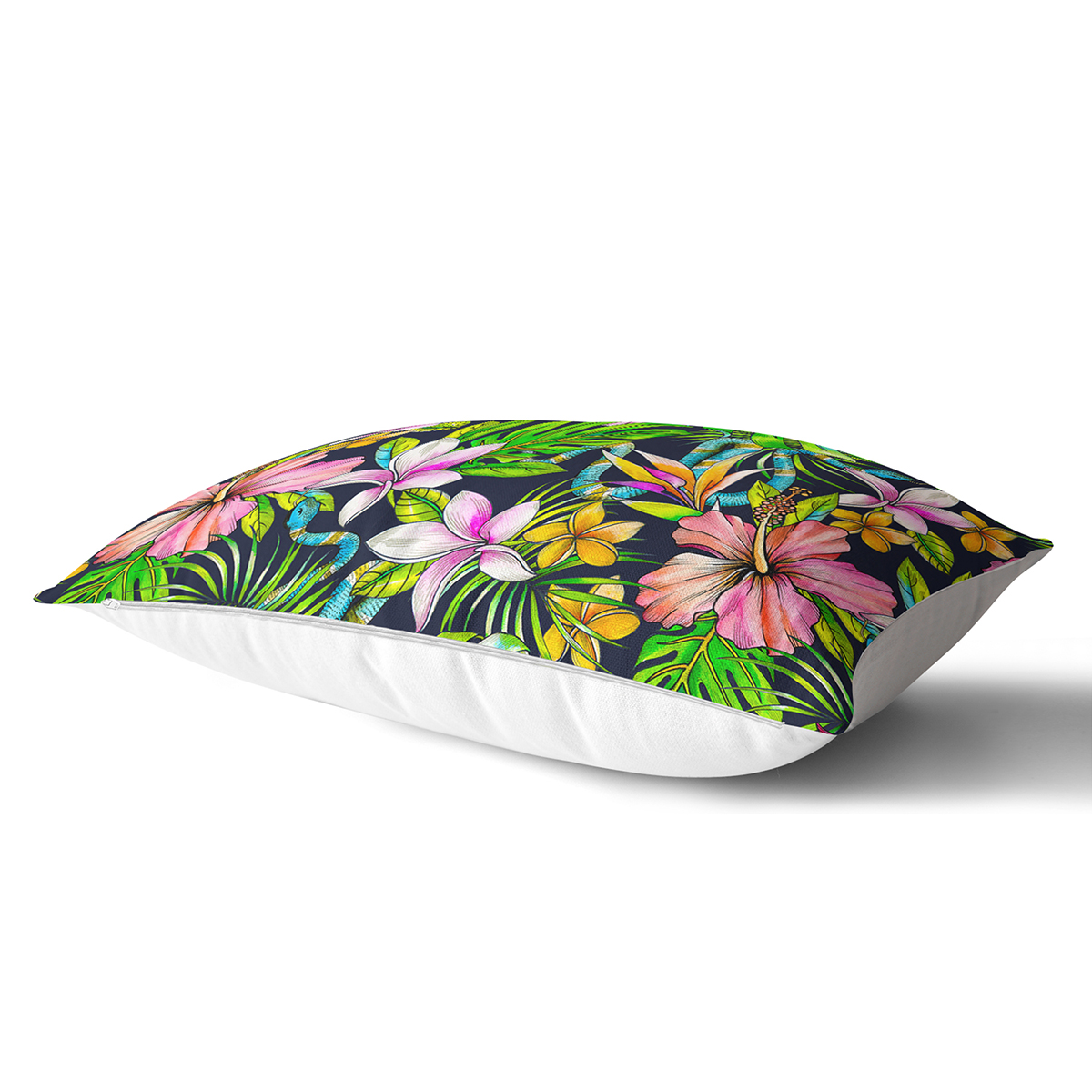 Lacivert Zeminli Tropikal Desenli Dijital Baskılı Dikdörtgen Yastık Kırlent Kılıfı
