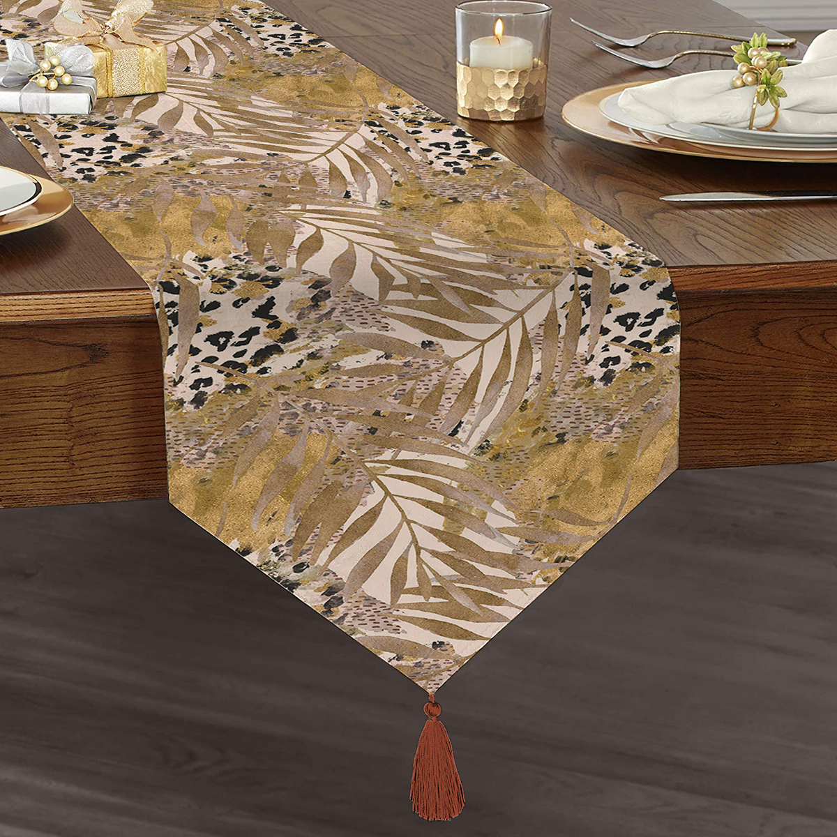 Leopar Temalı Kuru Yaprak Desenli Dijital Baskılı Püsküllü Şönil Üçgen Runner Realhomes
