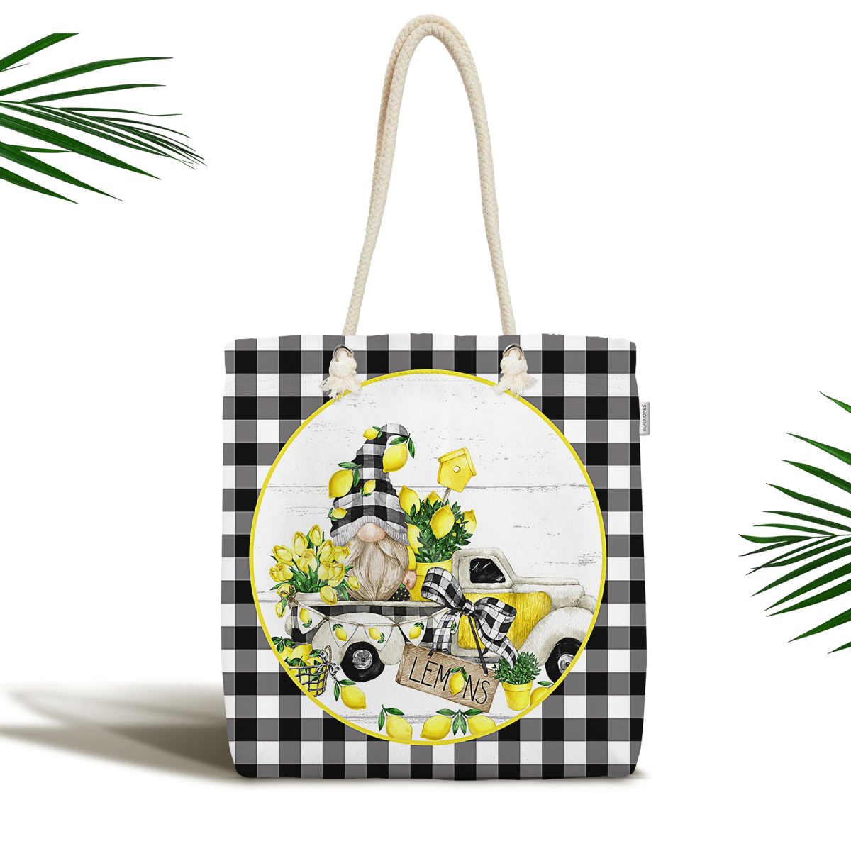 Limon Tasarımlı Ekose Motifli Fermuarlı Kumaş Plaj Çantası
