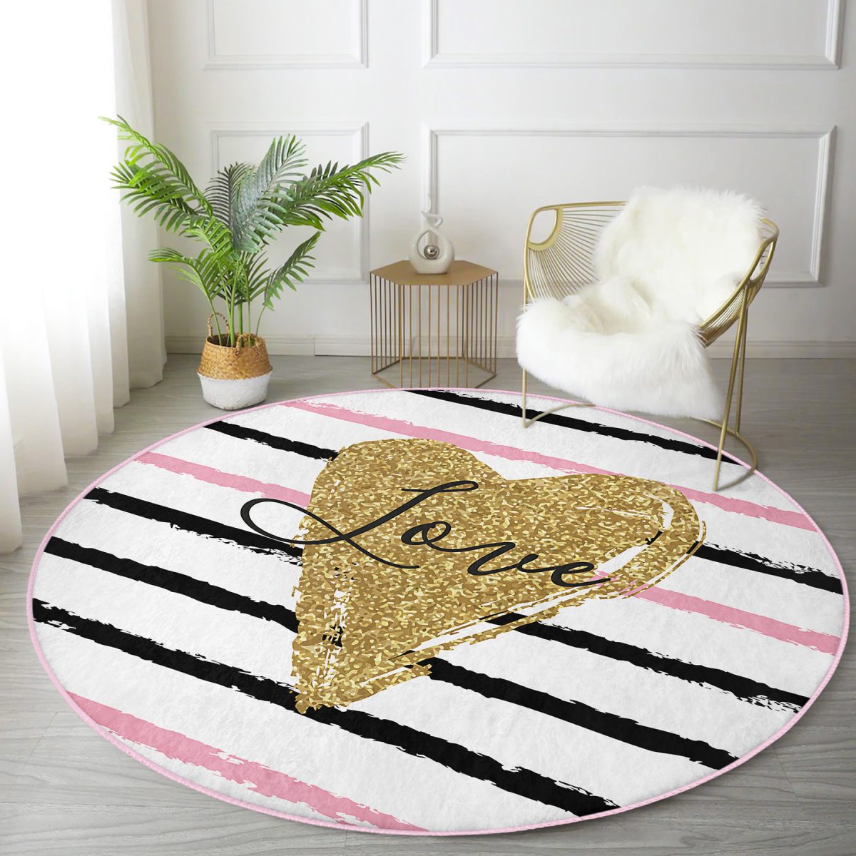 Love Yaldızlı Kalp Desenli Dijital Baskılı Modern Pembe Yatak Odası Yıkanabilir Kaymaz Tabanlı Yuvarlak Halı