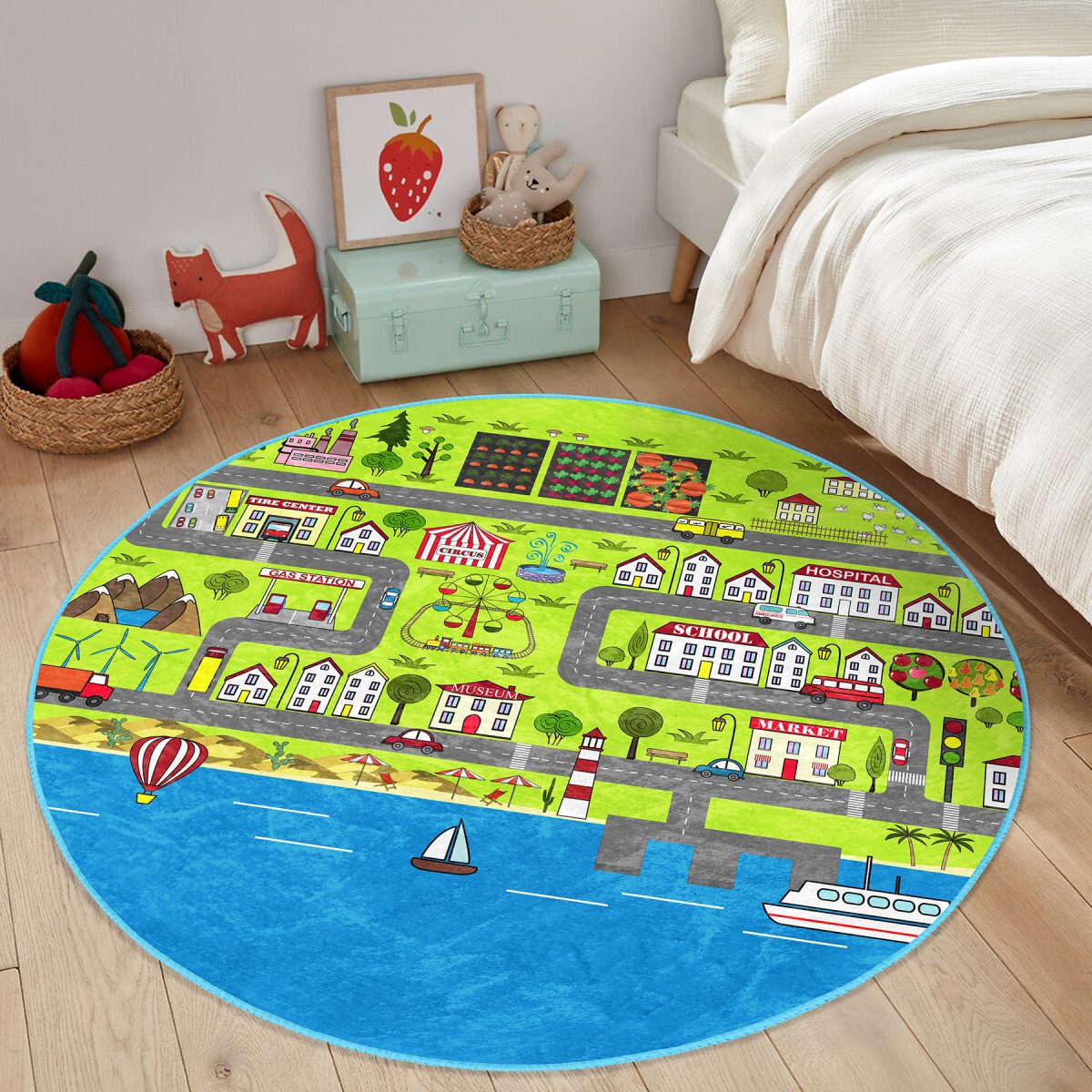 Mahalle Yolları Öğretici Oyun Tasarımlı Çocuk & Genç Odası Makinede Yıkanabilir Kaymaz Tabanlı Yuvarlak Çocuk Oyun Halısı
