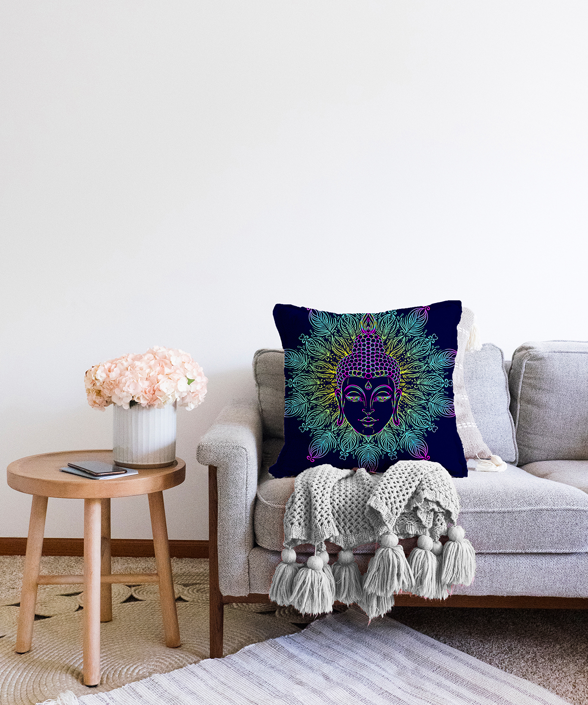 Mandala İçinde Buddha Çizimli Dekoratif Raşel Kadife Kırlent Kılıfı