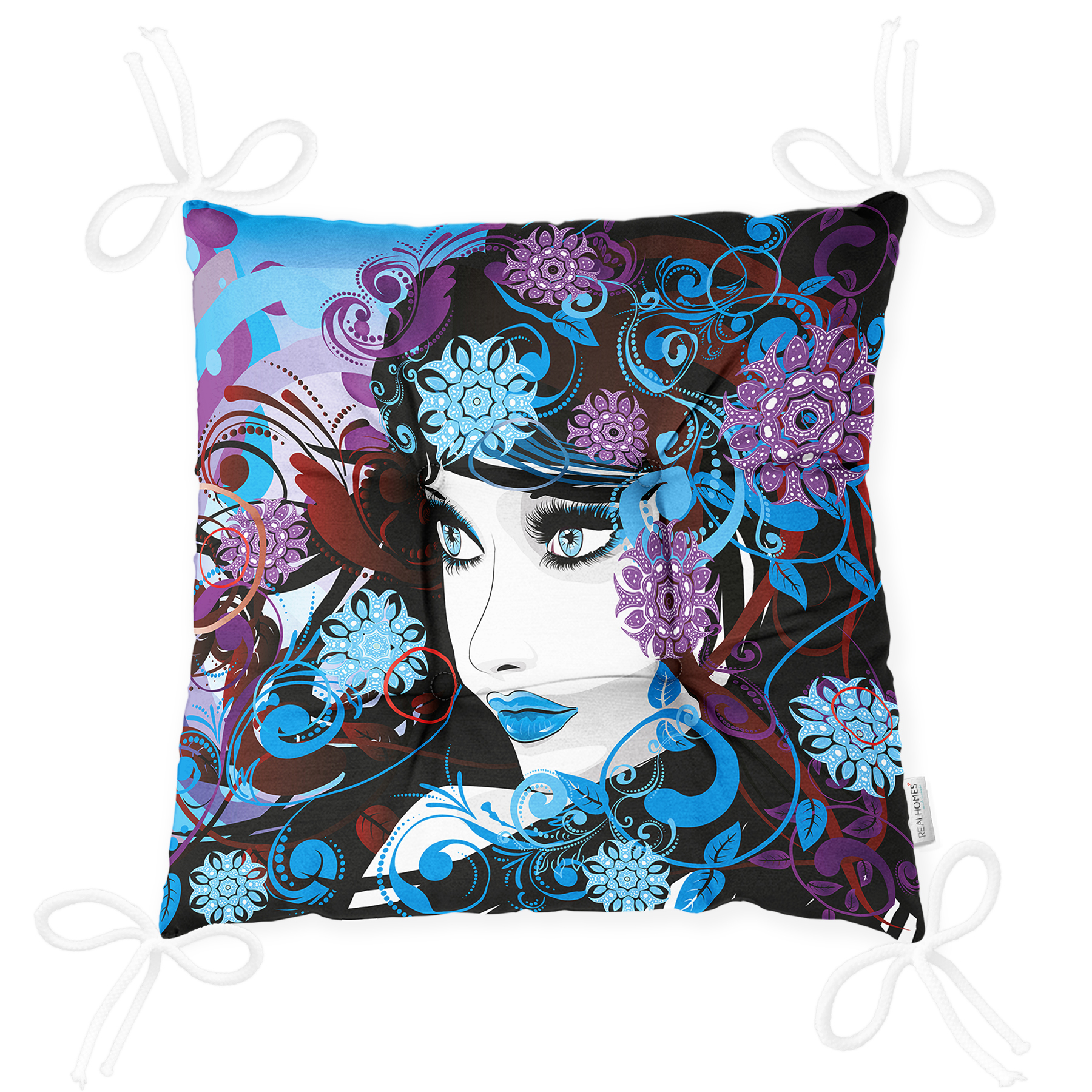 Mavi Ağırlıklı Çiçek Motifli Beautiful Girl Dekoratif Pofuduk Sandalye Minderi