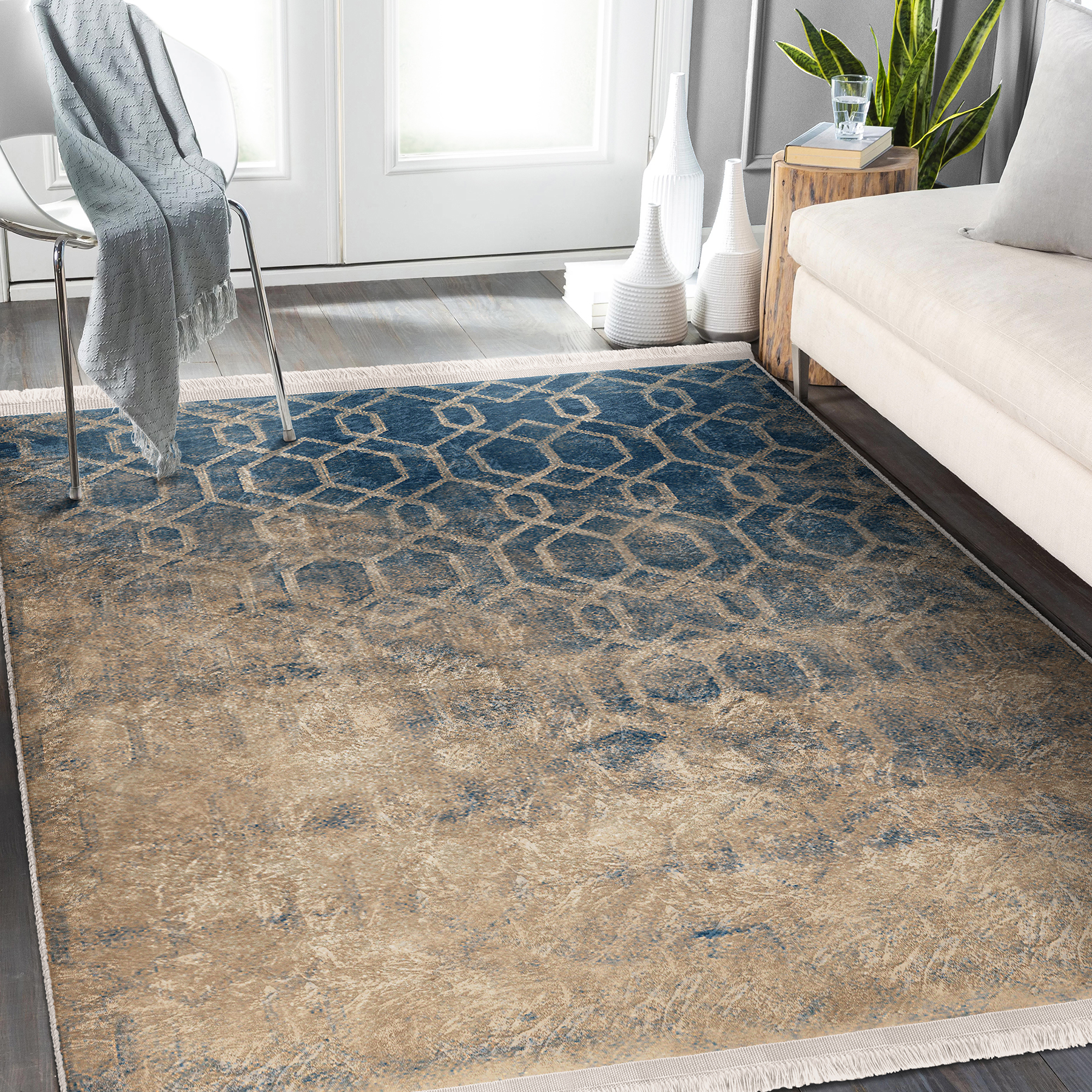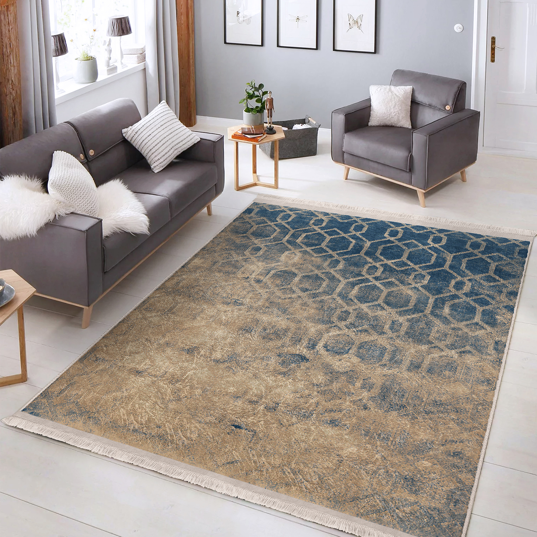 Mavi – Bej Zeminde Antik Motifli Dokuma Halı Desenli Geometrik Eskitme Motifli Koridor & Antre Salon & Oturma Odası Dijital Baskılı Makinede Yıkanabilir Kaymaz Taban Saçaklı Halı