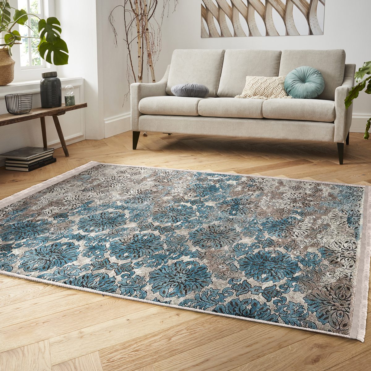 Mavi – Bej Zeminde Dokuma Halı Motifli Geleneksel Desenli Eskitme Motifli Etnik Motifler Salon & Oturma Odası Mutfak Dijital Baskılı Makinede Yıkanabilir Kaymaz Taban Saçaklı Halı