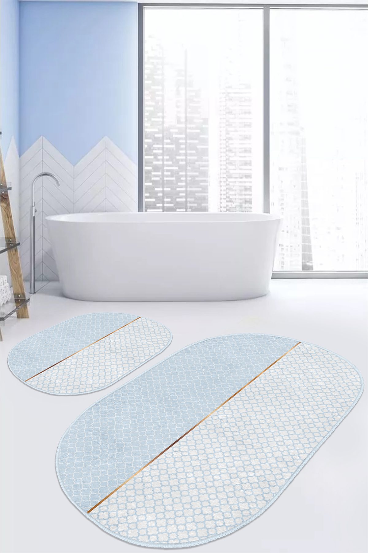 Mavi Beyaz Ogea Özel Tasarımlı 2’li Oval Kaymaz Tabanlı Banyo & Mutfak Paspas Takımı