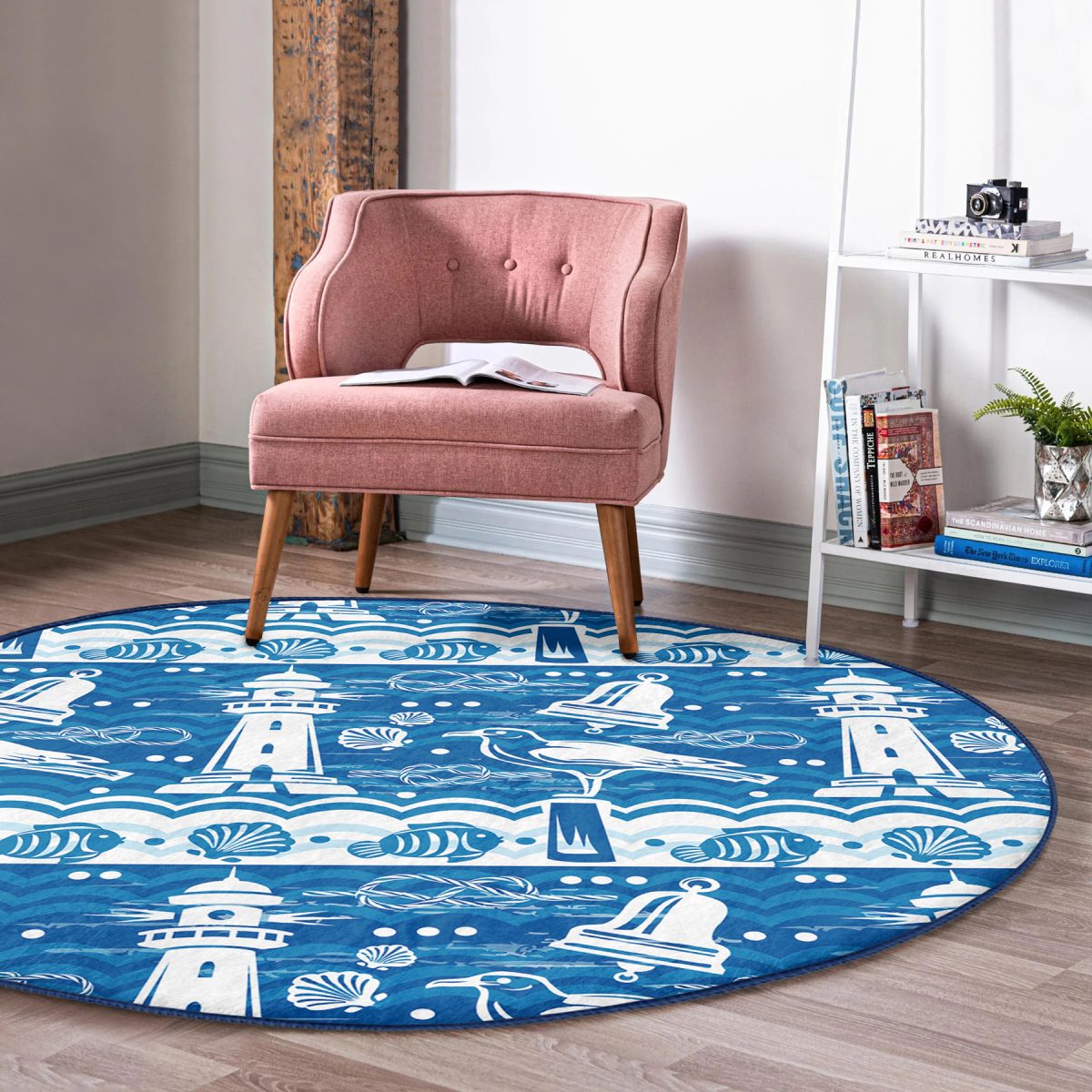 Mavi Beyaz Zeminli Yelken Desenli Dijital Baskılı Modern Lacivert Outdoor Yıkanabilir Kaymaz Tabanlı Yuvarlak Halı