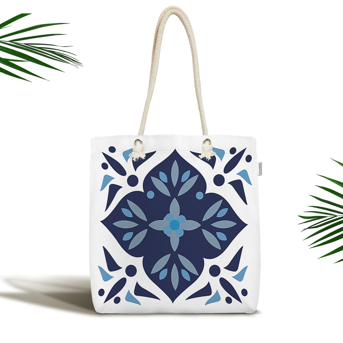 Mavi Çini Motifli Dekoratif Fermuarlı Kumaş Omuz Çantası
