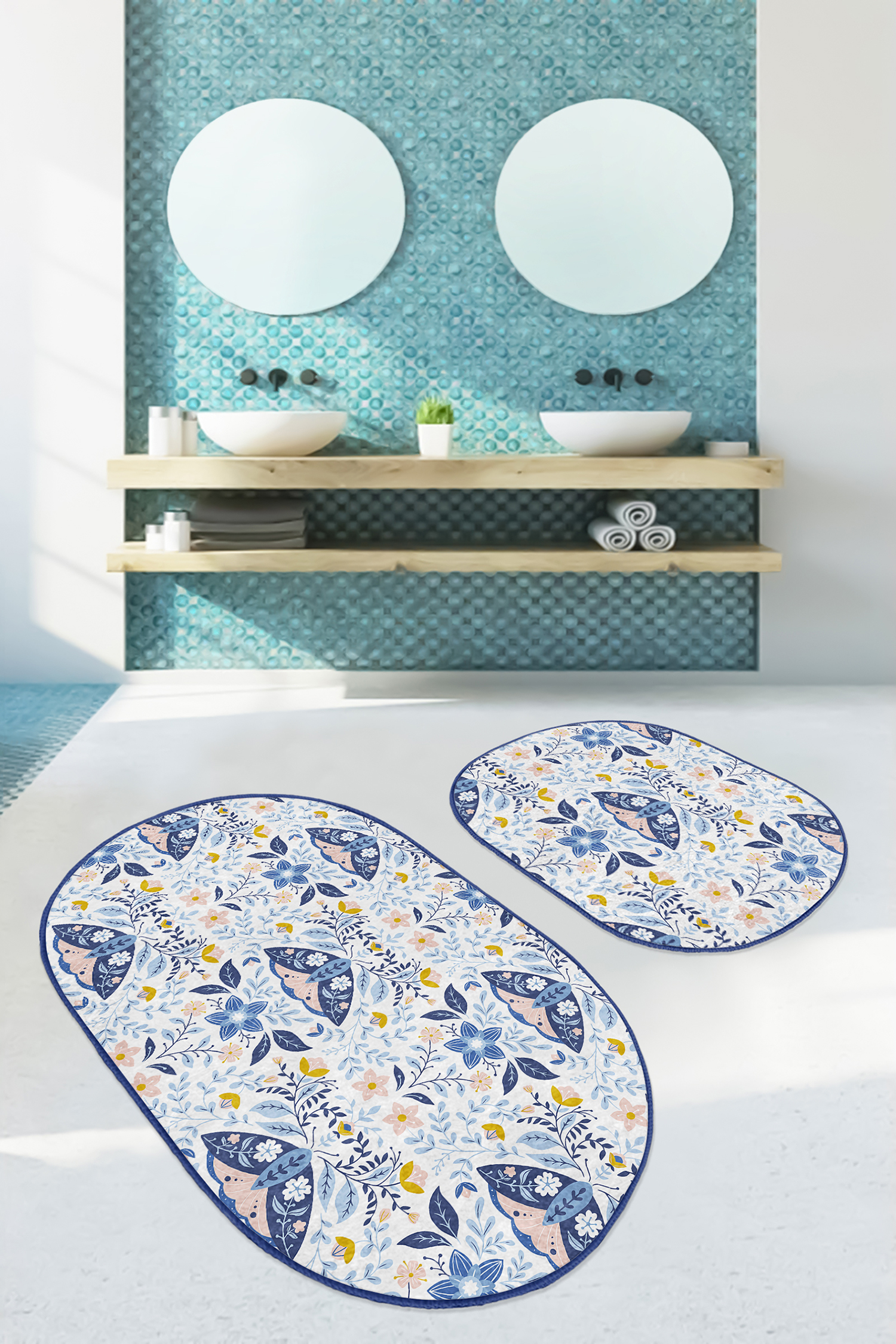 Mavi Çini Motifli Kelebek Tasarımlı Dijital Baskılı 2'li Oval Kaymaz Tabanlı Banyo & Mutfak Paspas Takımı Realhomes