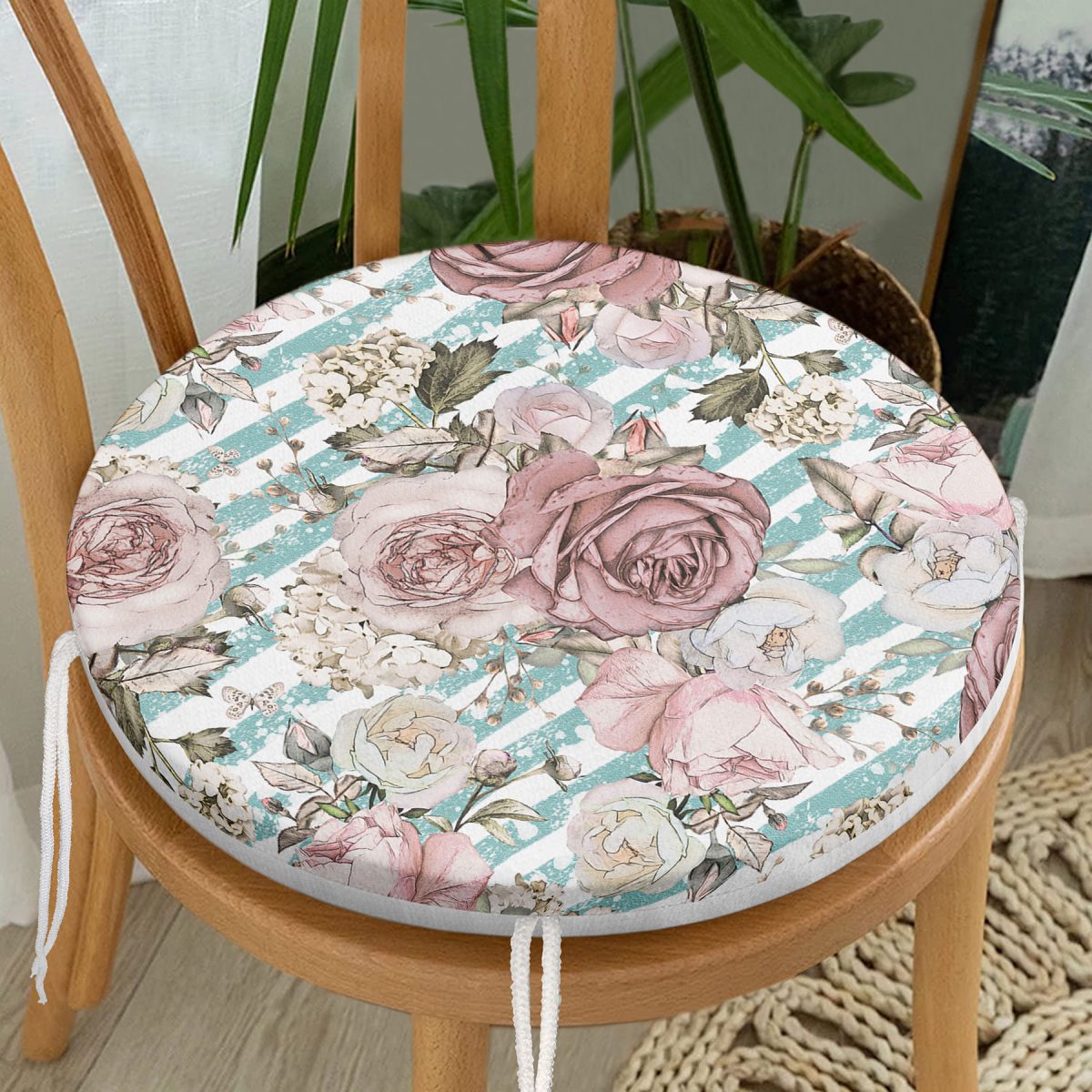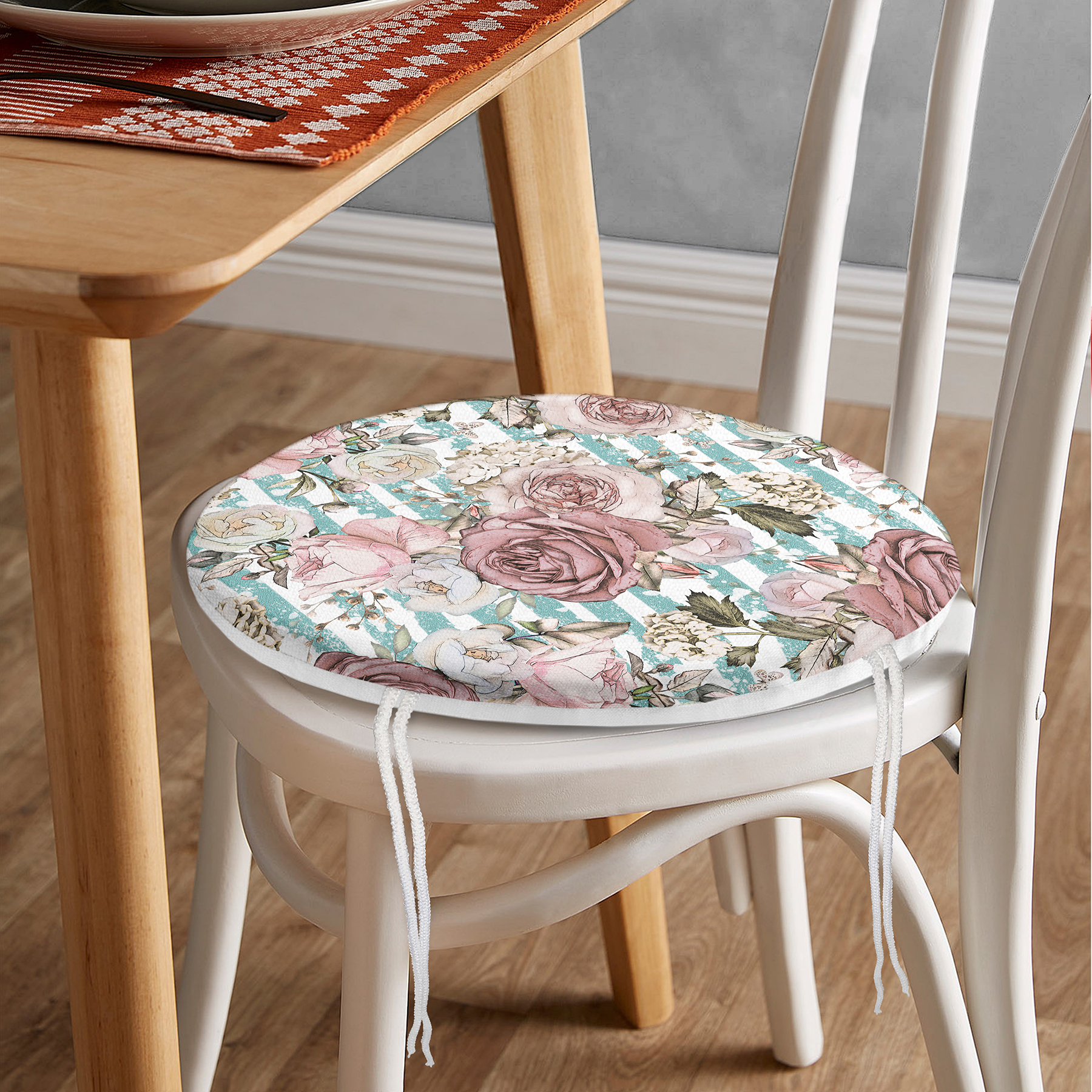 Mavi Çizgi Desenli Kanaviçe Çiçek Motifli Yuvarlak Fermuarlı Sandalye Minderi Realhomes