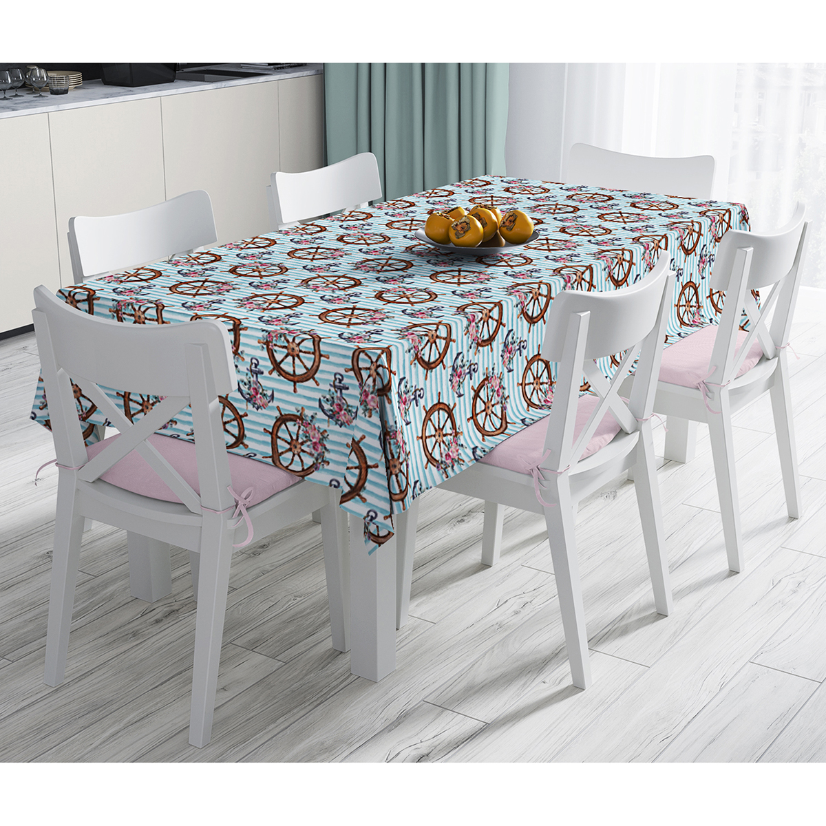 Mavi Çizgili Çapa & Dümen Motifli Dijital Baskılı Modern Masa Örtüsü