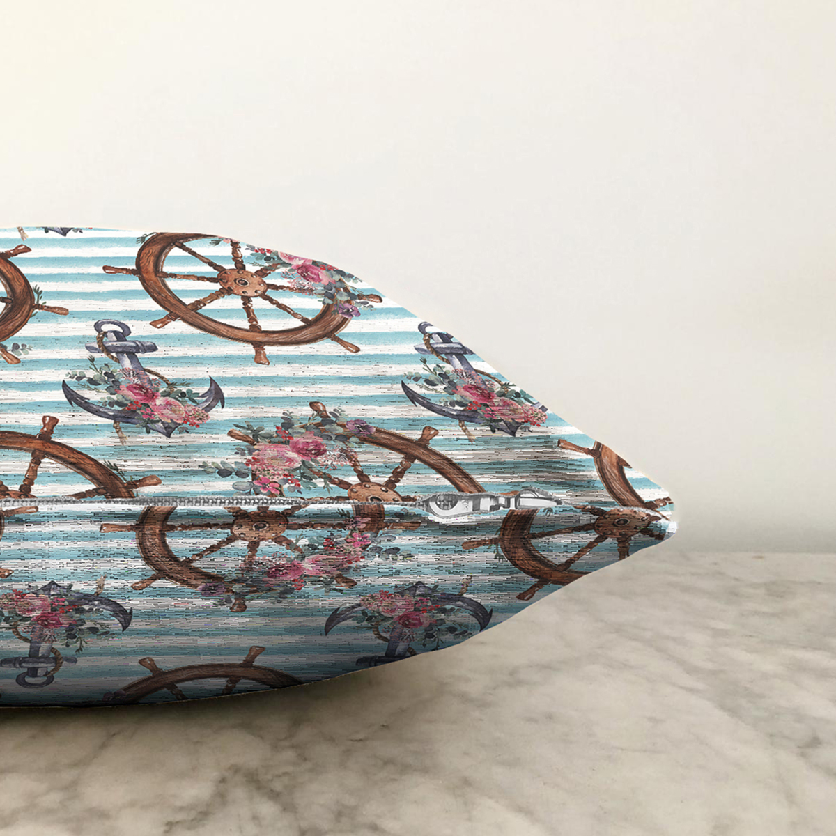 Mavi Çizgili Çapa & Dümen Motifli Dijital Baskılı Modern Raşel Kadife Yastık Kırlent Kılıfı