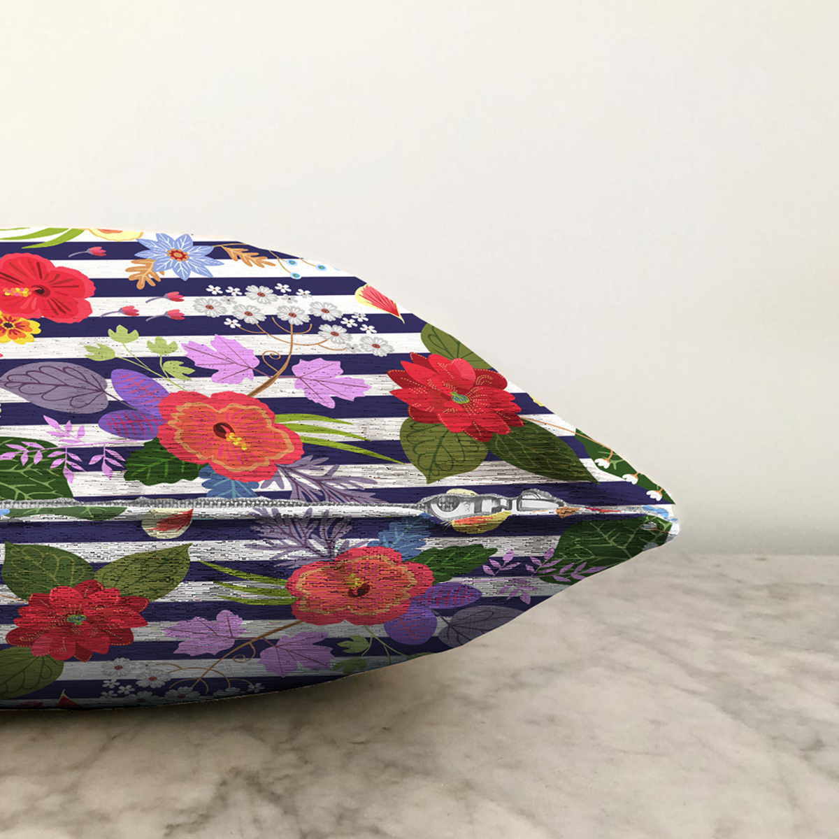 Mavi Çizgili Çiçek Desenli Özel Tasarım Dijital Baskılı Modern Raşel Kadife Yastık Kırlent Kılıfı