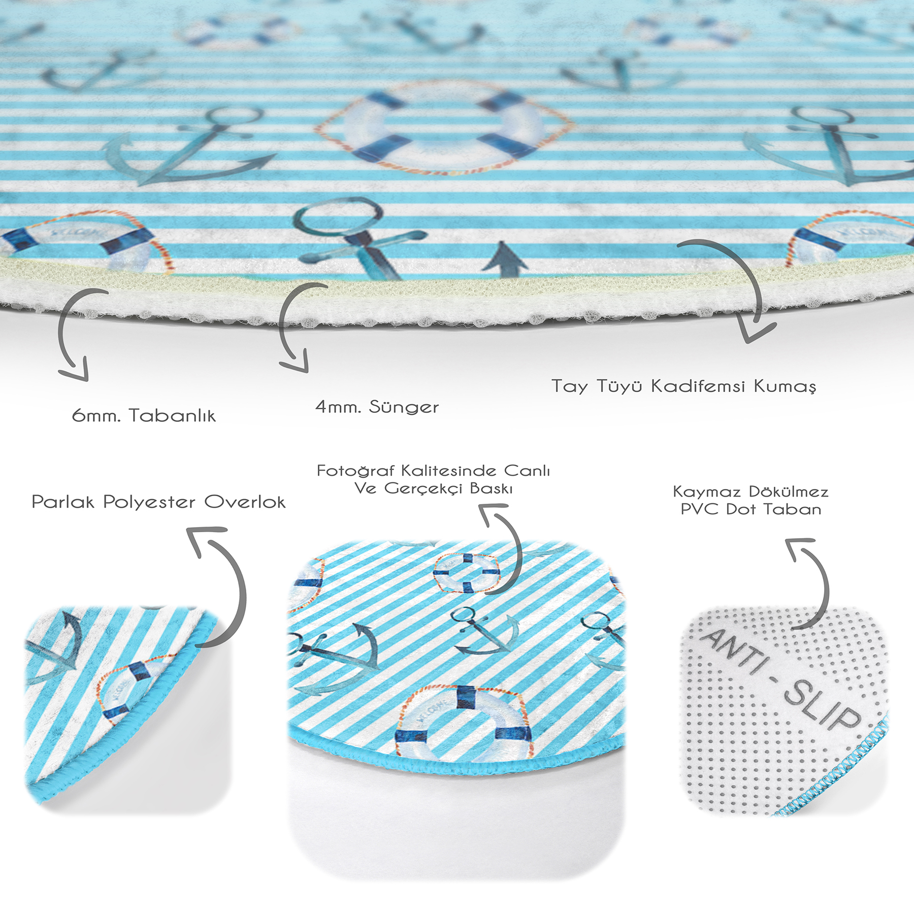 Mavi Çizgili Denizci Tasarımlı Çocuk & Genç Odası Makinede Yıkanabilir Kaymaz Tabanlı Yuvarlak Çocuk Halısı