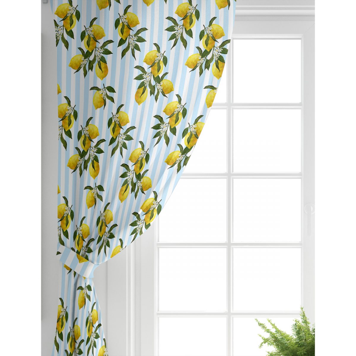 Mavi Çizgili Limon Desenli Dijital Baskılı Salon Fon Perde