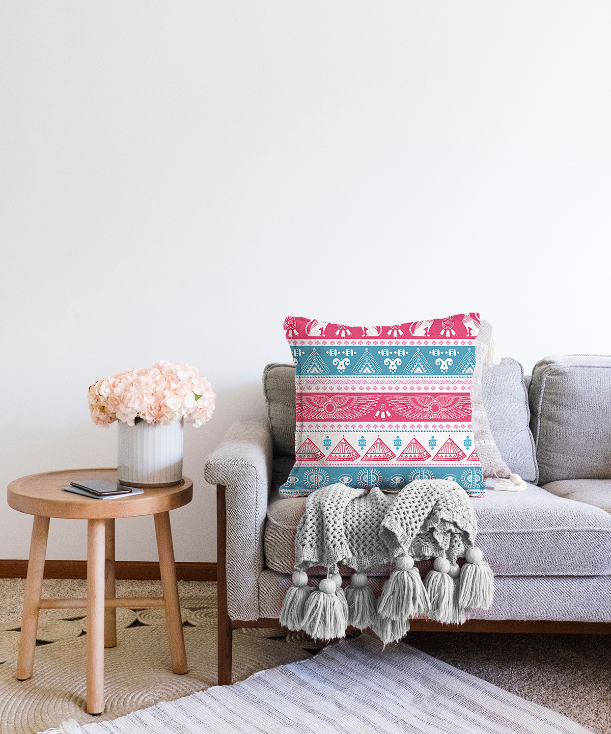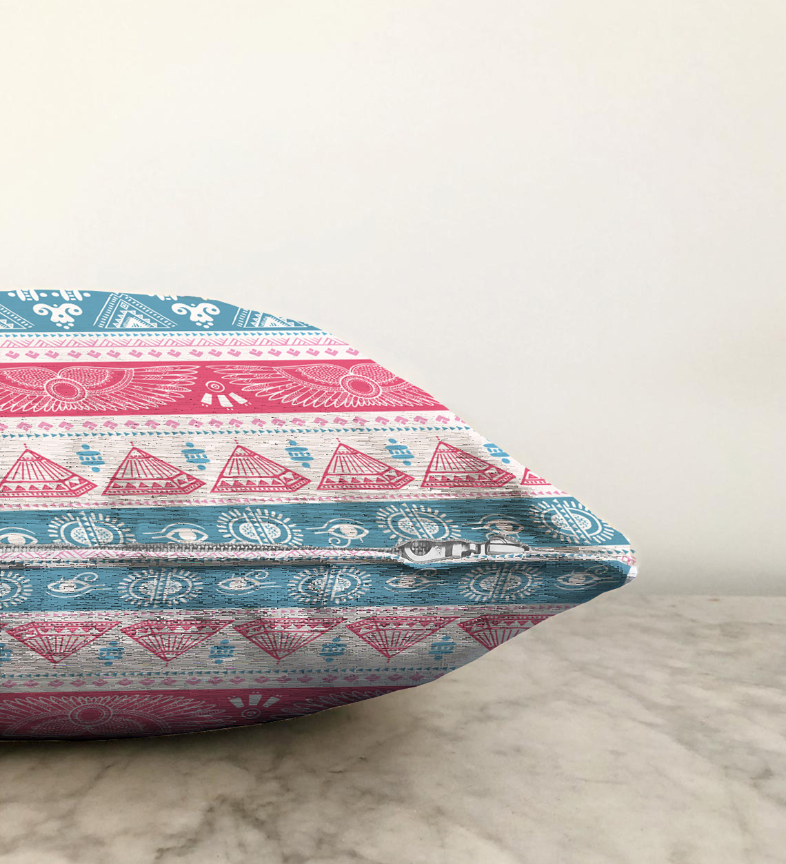 Mavi Pembe Etnik Desenli Dekoratif Raşel Kadife Yastık Kırlent Kılıfı