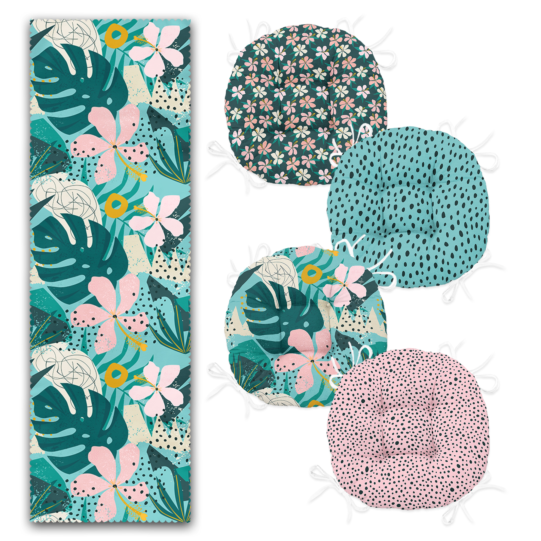 Mavi & Pembe Renkli 4 Yuvarlak Pofuduk Sandalye Minderi ve 1 Runner Seti