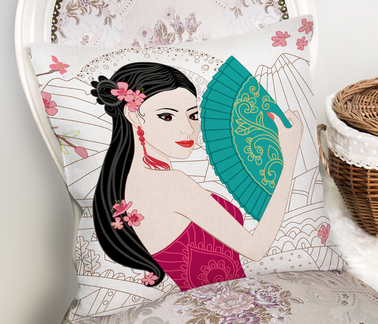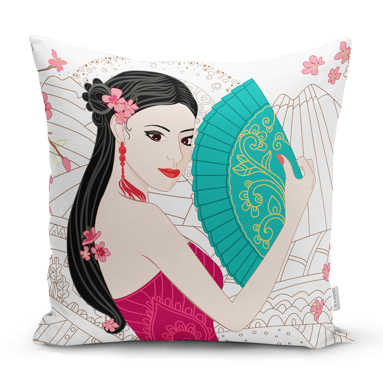 Mavi Yelpazeli Çizgi Motifli Kadın Motifli Dekoratif Yastık Kılıfı Realhomes