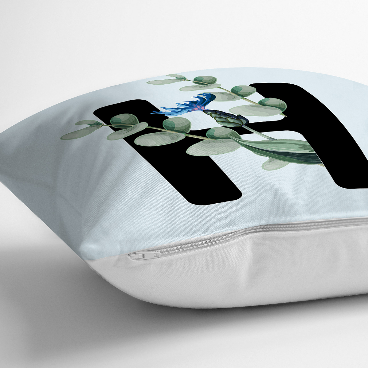 Mavi Zemin Çiçek Desenli Siyah H Harfi Özel Tasarım Dijital Baskılı Yastık Kırlent Kılıfı Realhomes