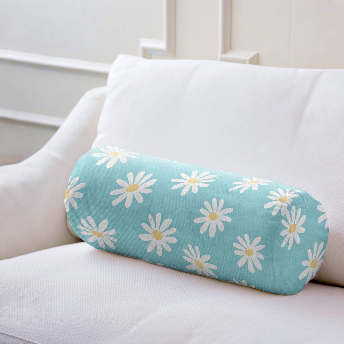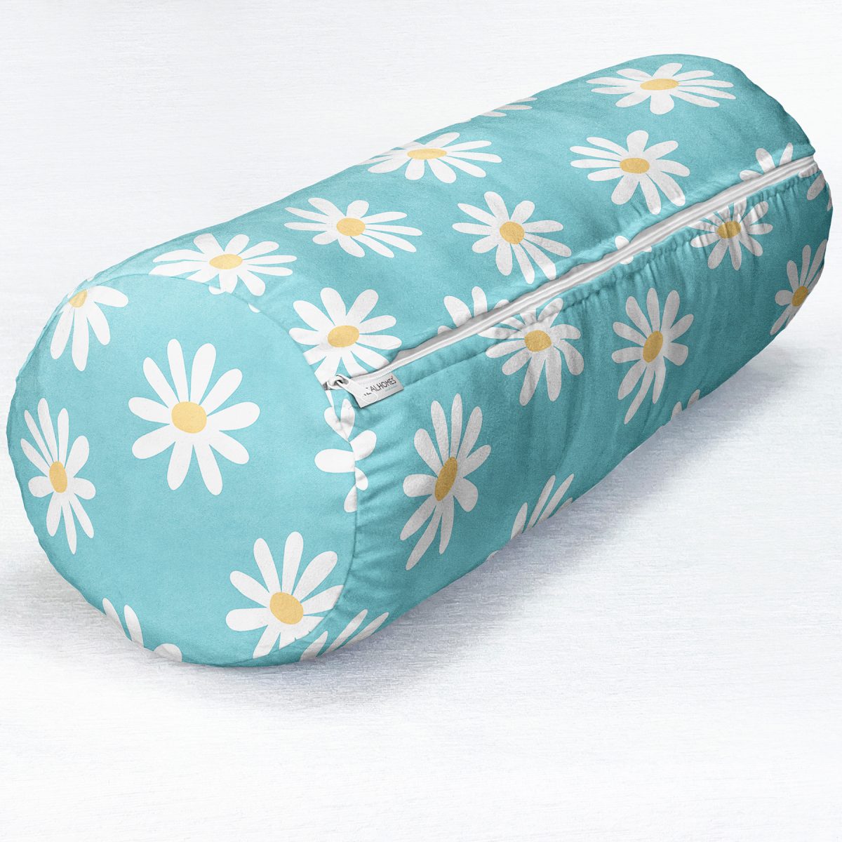 Mavi Zemin Papatya Çizimli Dijital Baskılı Modern İç Dolgulu – Fermuarlı Süet Berjer Silindir Yastık Kırlent