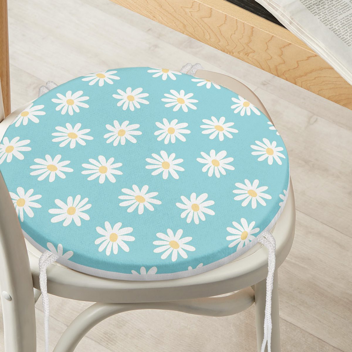Mavi Zemin Papatya Çizimli Dijital Baskılı Modern Yuvarlak Fermuarlı Sandalye Minderi
