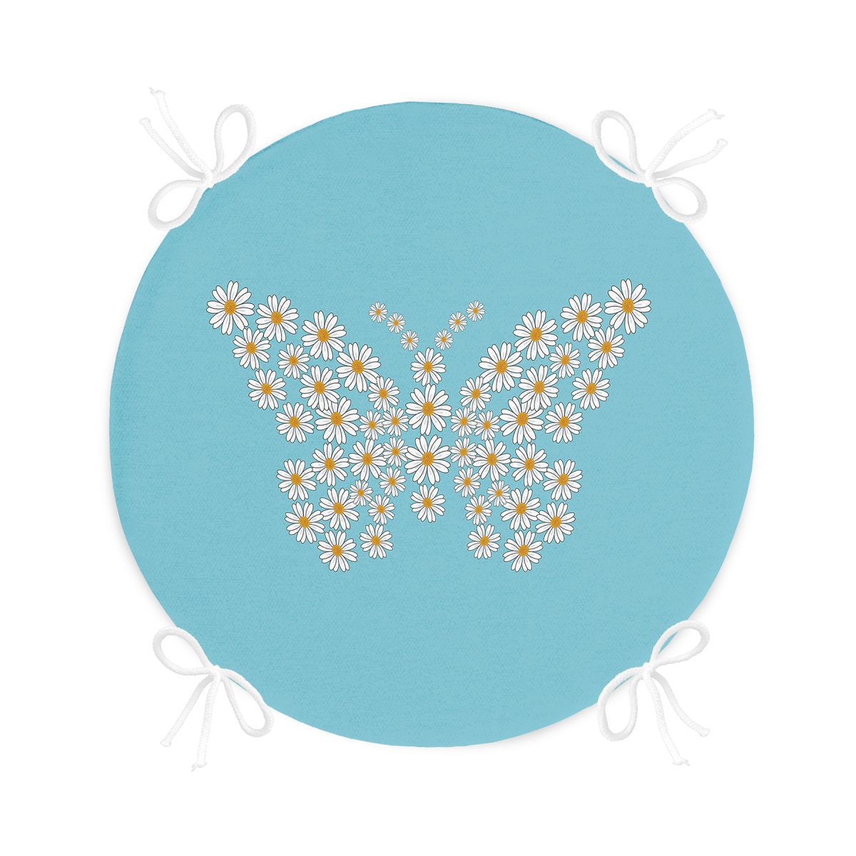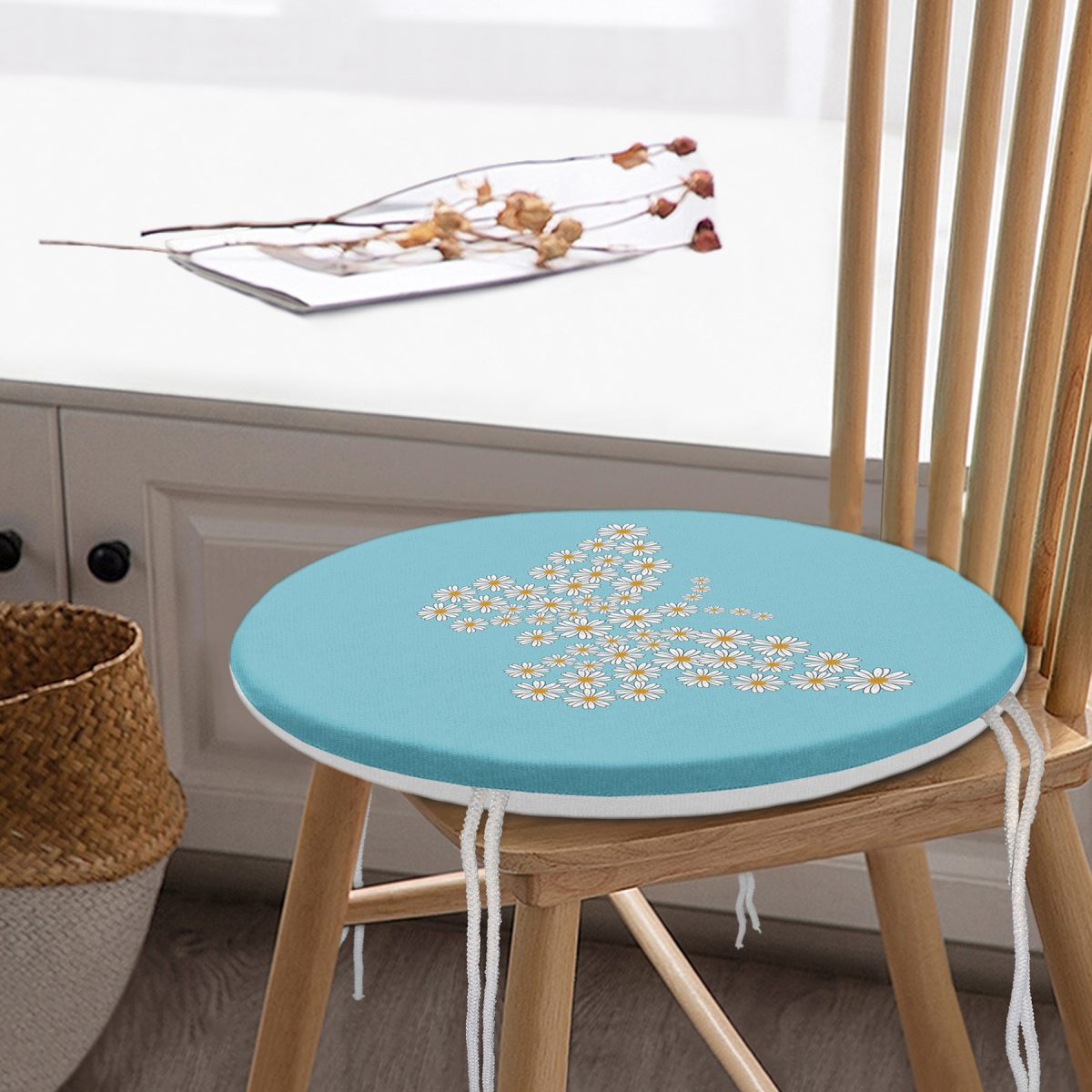 Mavi Zemin Papatyadan Kelebek Tasarımlı Dijital Baskılı Modern Yuvarlak Fermuarlı Sandalye Minderi
