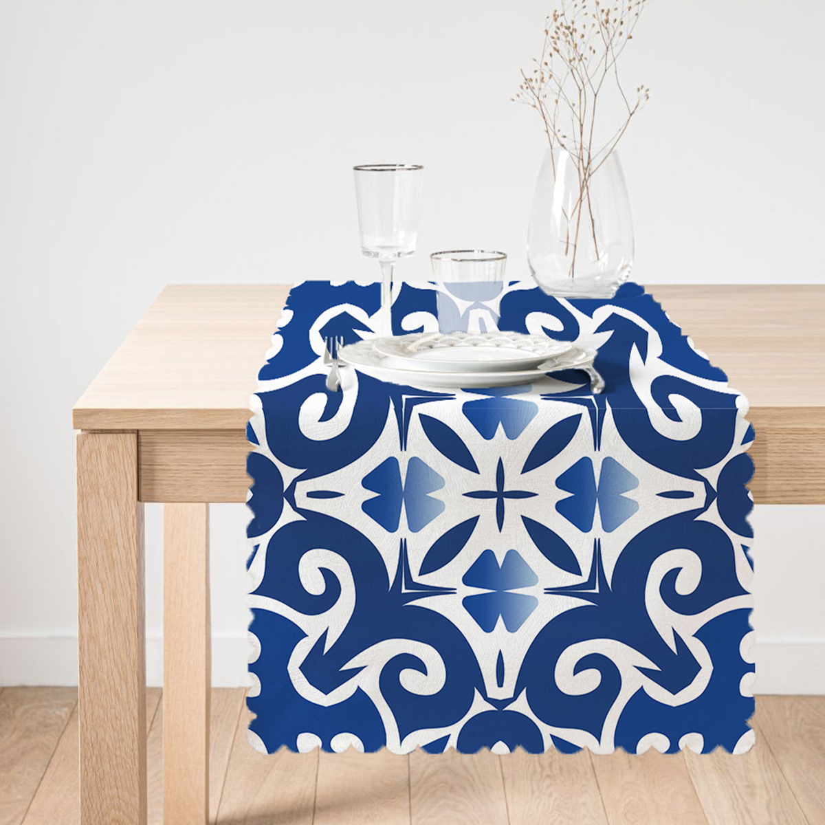 Mavi Zemin Üzerinde Çini Desenli Dijital Baskılı Modern Runner Realhomes