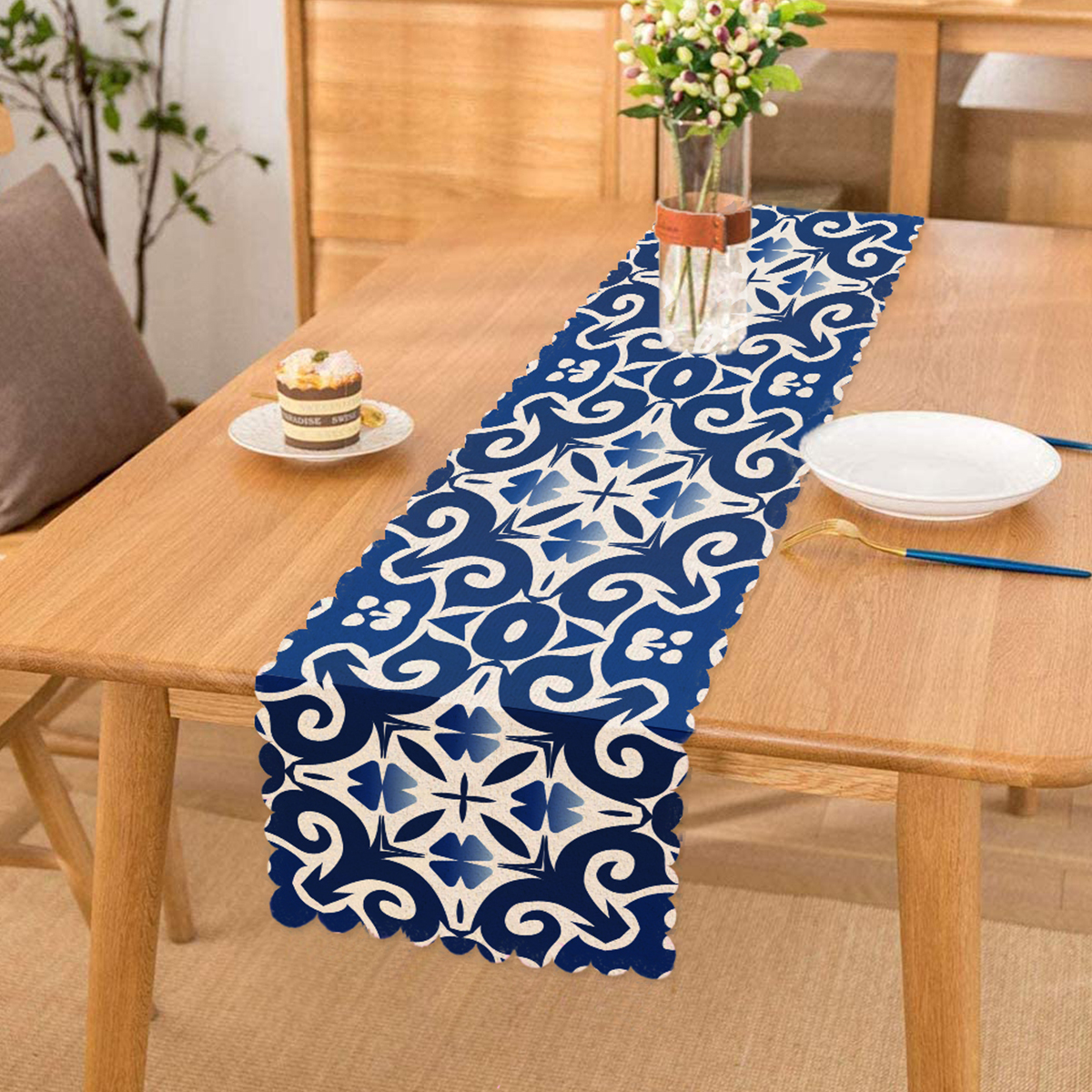 Mavi Zemin Üzerinde Çini Desenli Dijital Baskılı Modern Runner