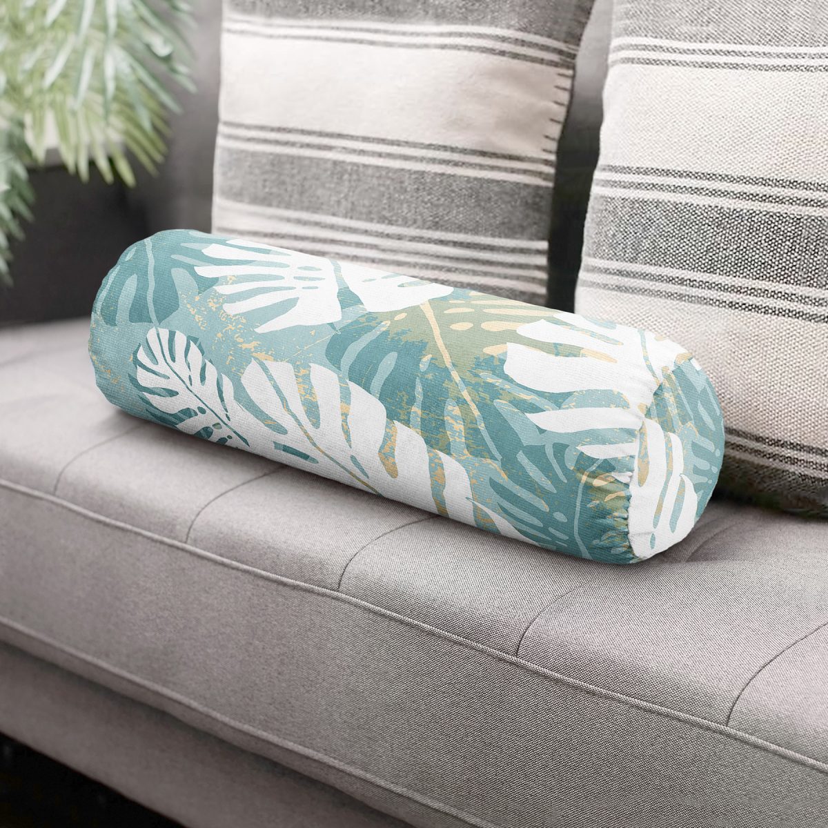Mavi Zemin Yapraklı Tasarım Desenli Dijital Baskılı Dekoratif İç Dolgulu – Fermuarlı Süet Berjer Silindir Yastık Kırlent
