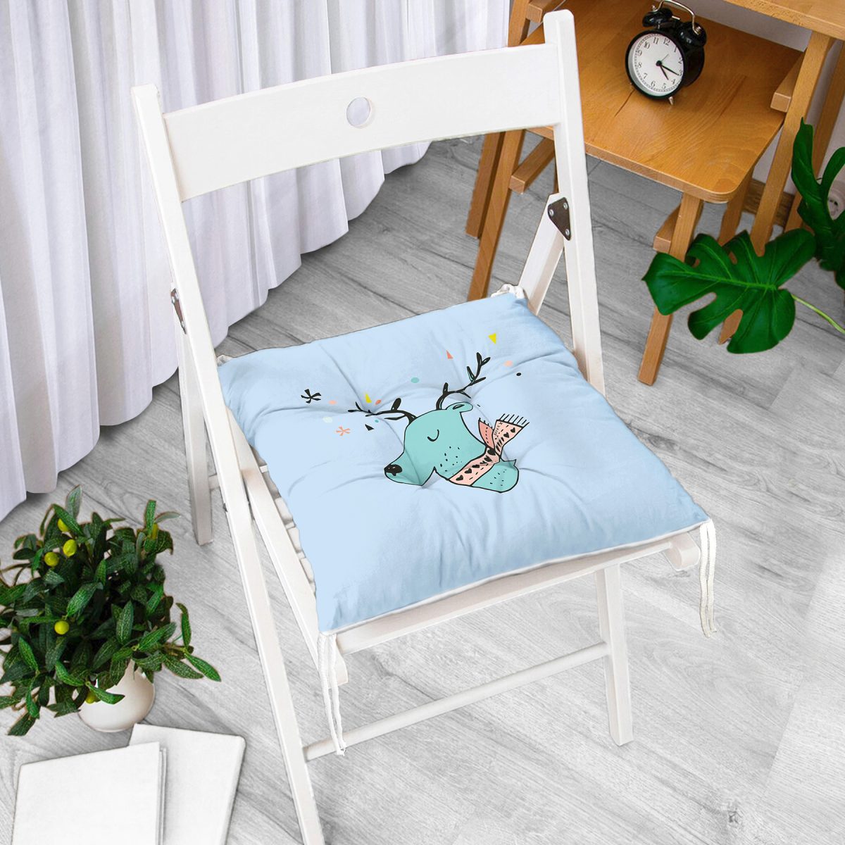 Mavi Zeminde Atkılı Sevimli Geyik Desenli Dijital Baskılı Modern Pofuduk Sandalye Minderi