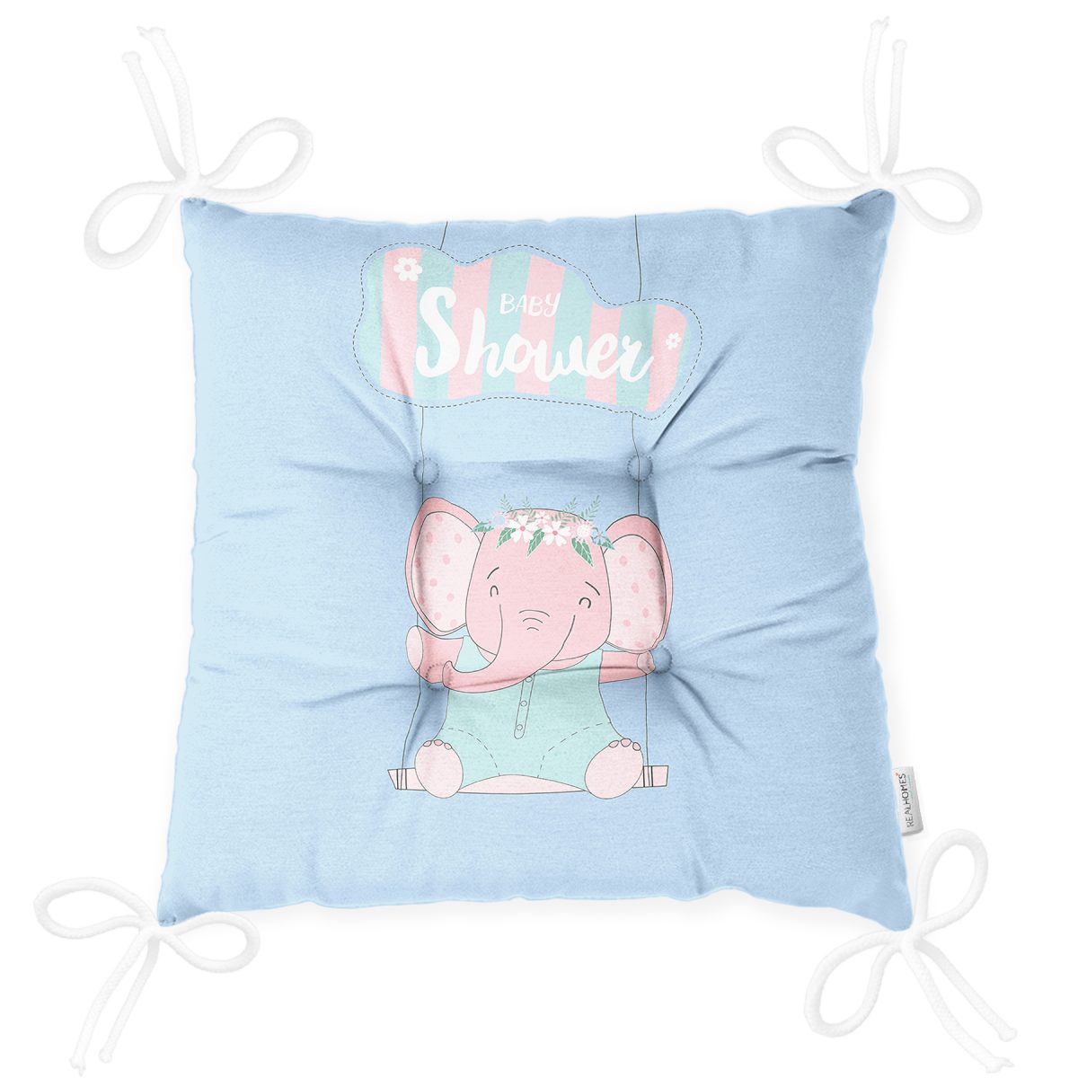 Mavi Zeminde Baby Shower Temalı Fil Desenli Dijital Baskılı Çocuk Odası Pofuduk Sandalye Minderi Realhomes