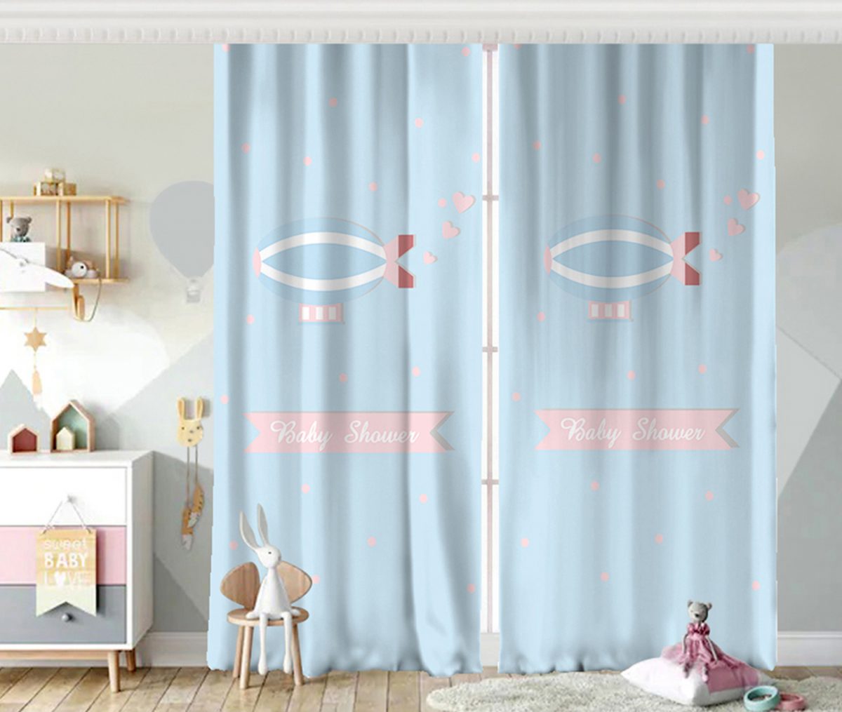 Mavi Zeminde Balon Tasarımlı Bebek Odası Fon Perde