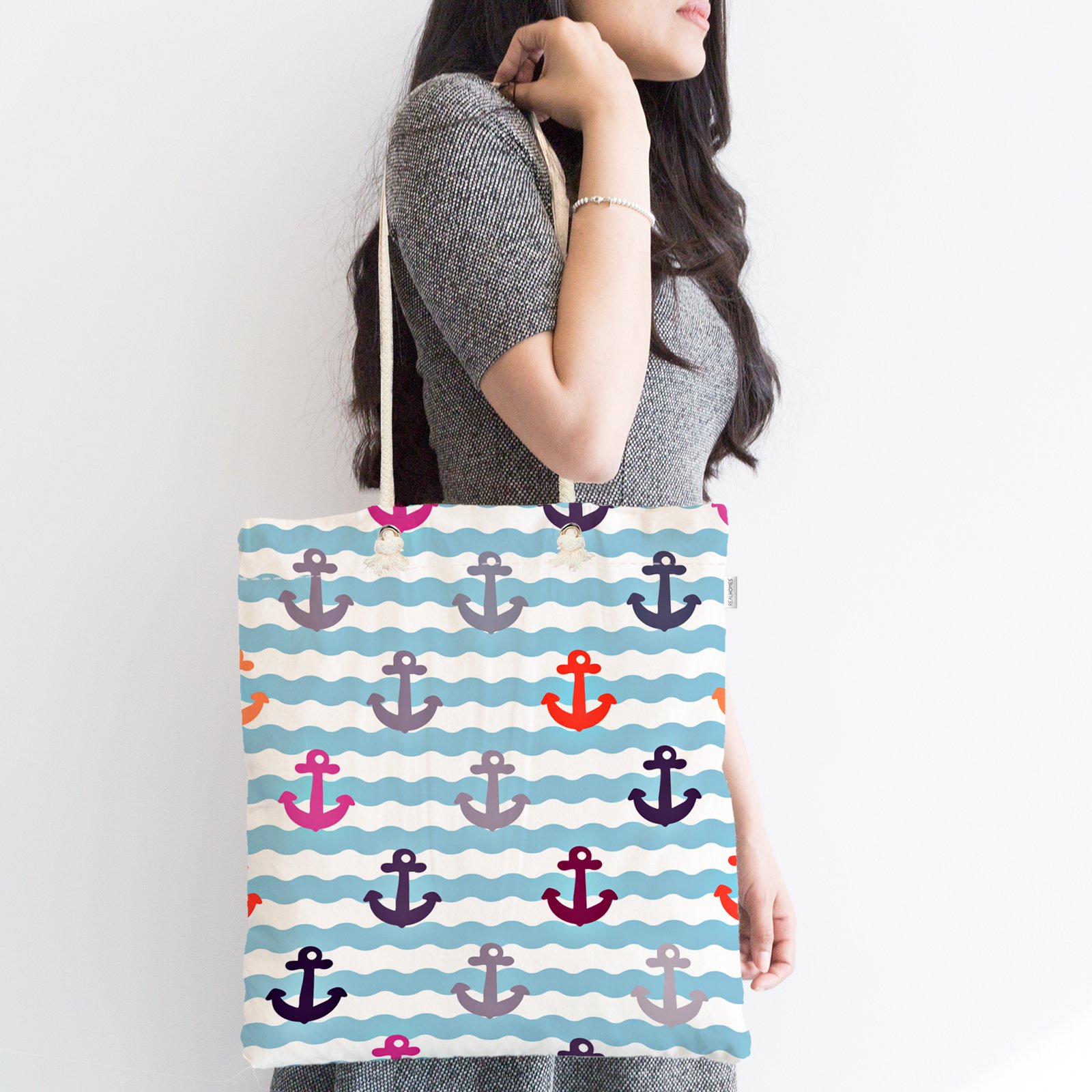 Mavi Zeminde Denizci Desenli Dijital Baskılı Fermuarlı Kumaş Çanta