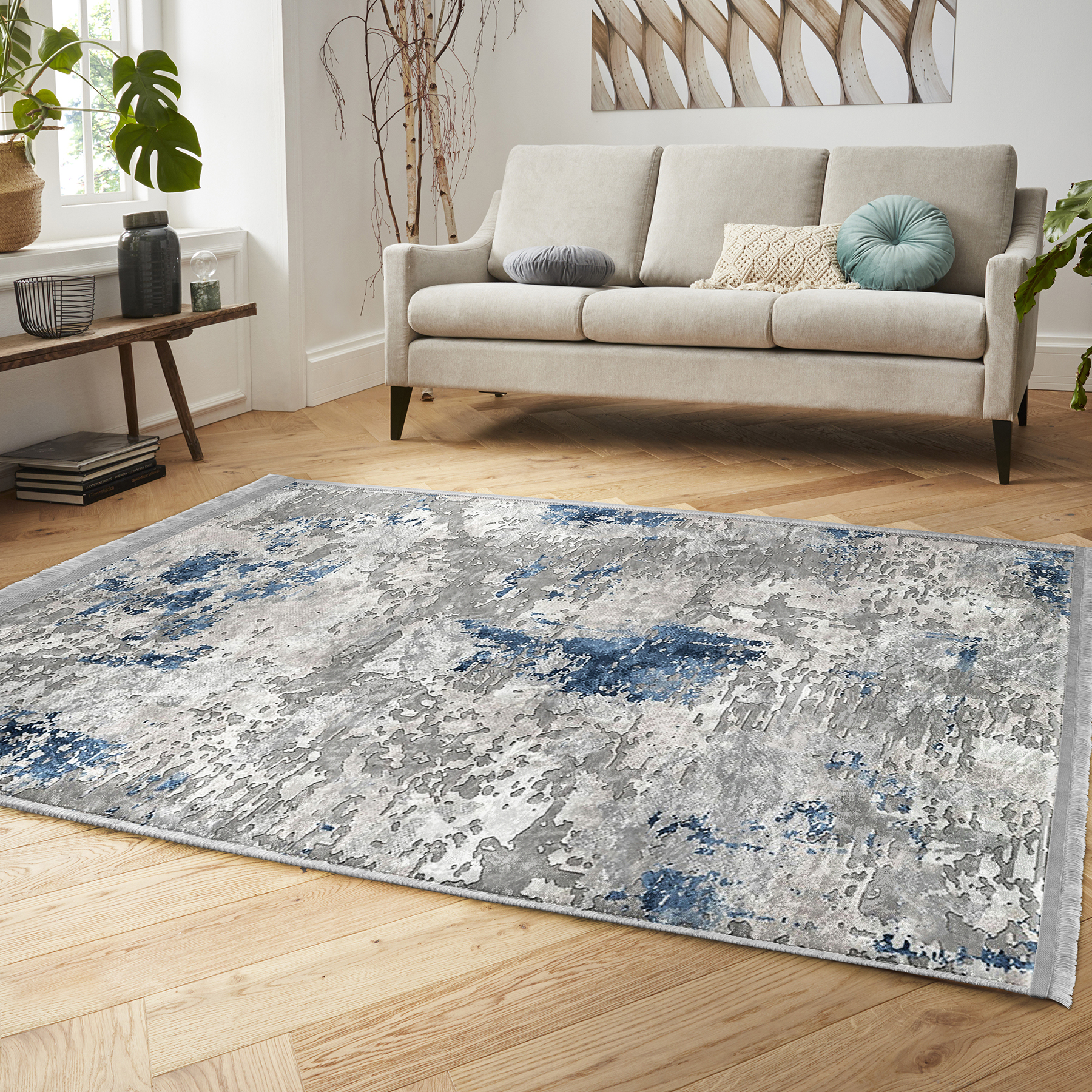 Mavi Zeminde Sulu boya Motifli Duvar Desenli Eskitme Motifli Vintage Salon & Oturma Odası Koridor & Antre Dijital Baskılı Makinede Yıkanabilir Kaymaz Taban Saçaklı Halı