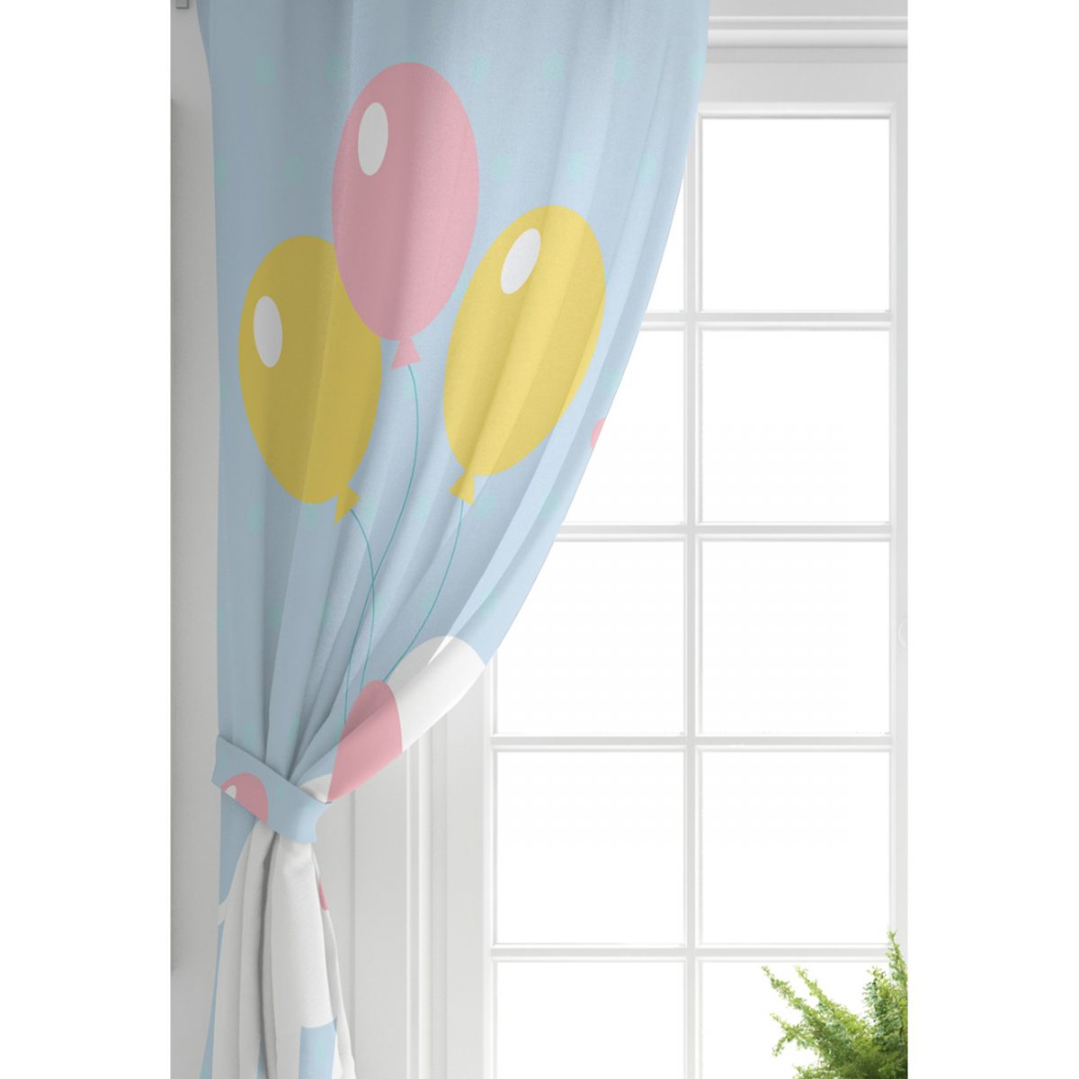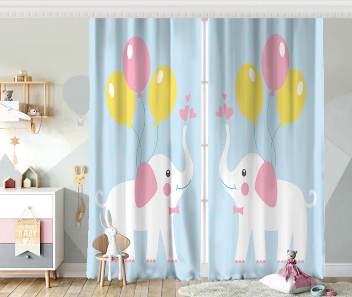 Mavi Zeminde Fil ve Balon Desenli Çocuk Odası Fon Perde