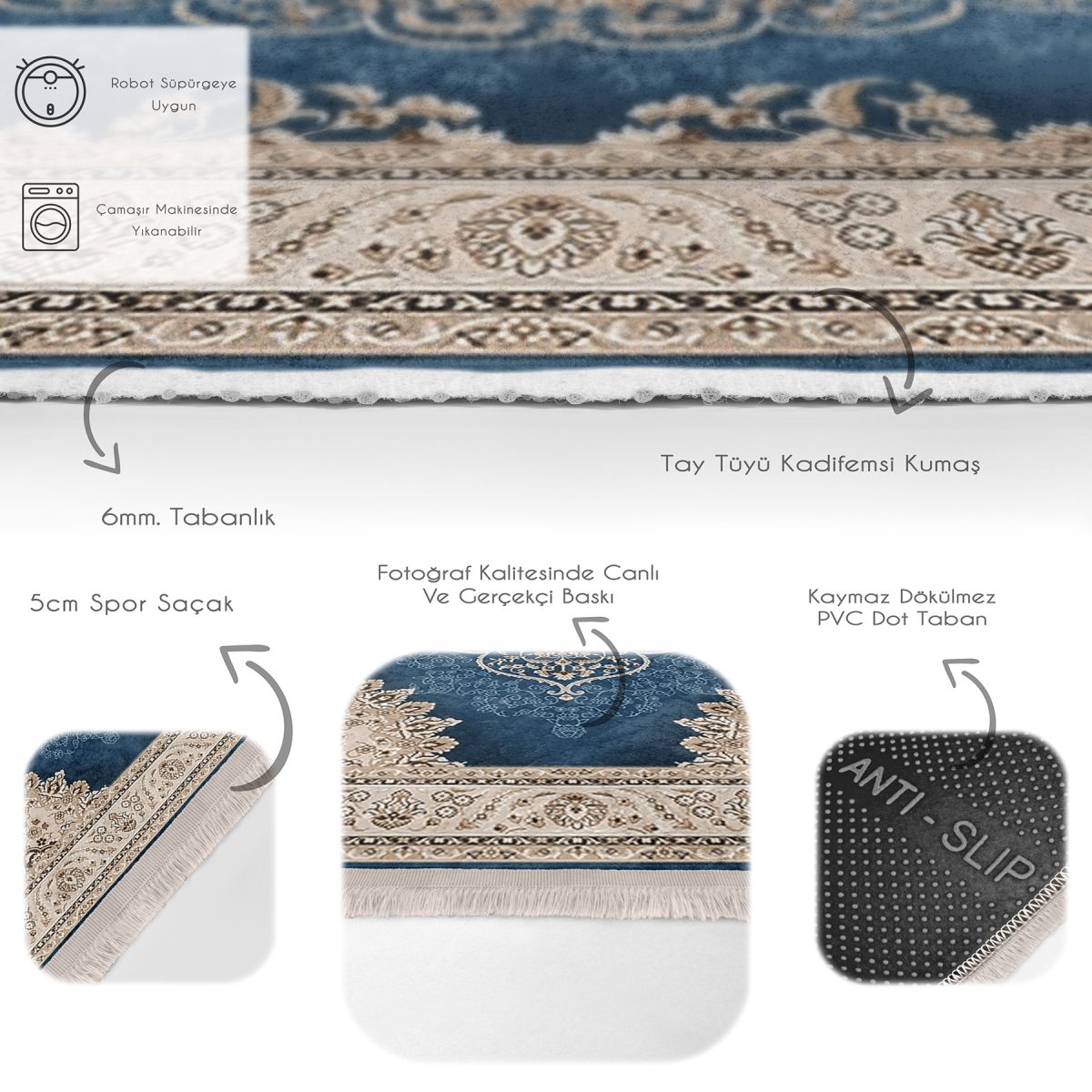 Lacivert Zeminde Osmanlı Motifli Altın Detay Desenli Avangarde Eskitme Motifli Salon & Oturma Odası Yatak Odası Dijital Baskılı Makinede Yıkanabilir Kaymaz Taban Saçaklı Halı
