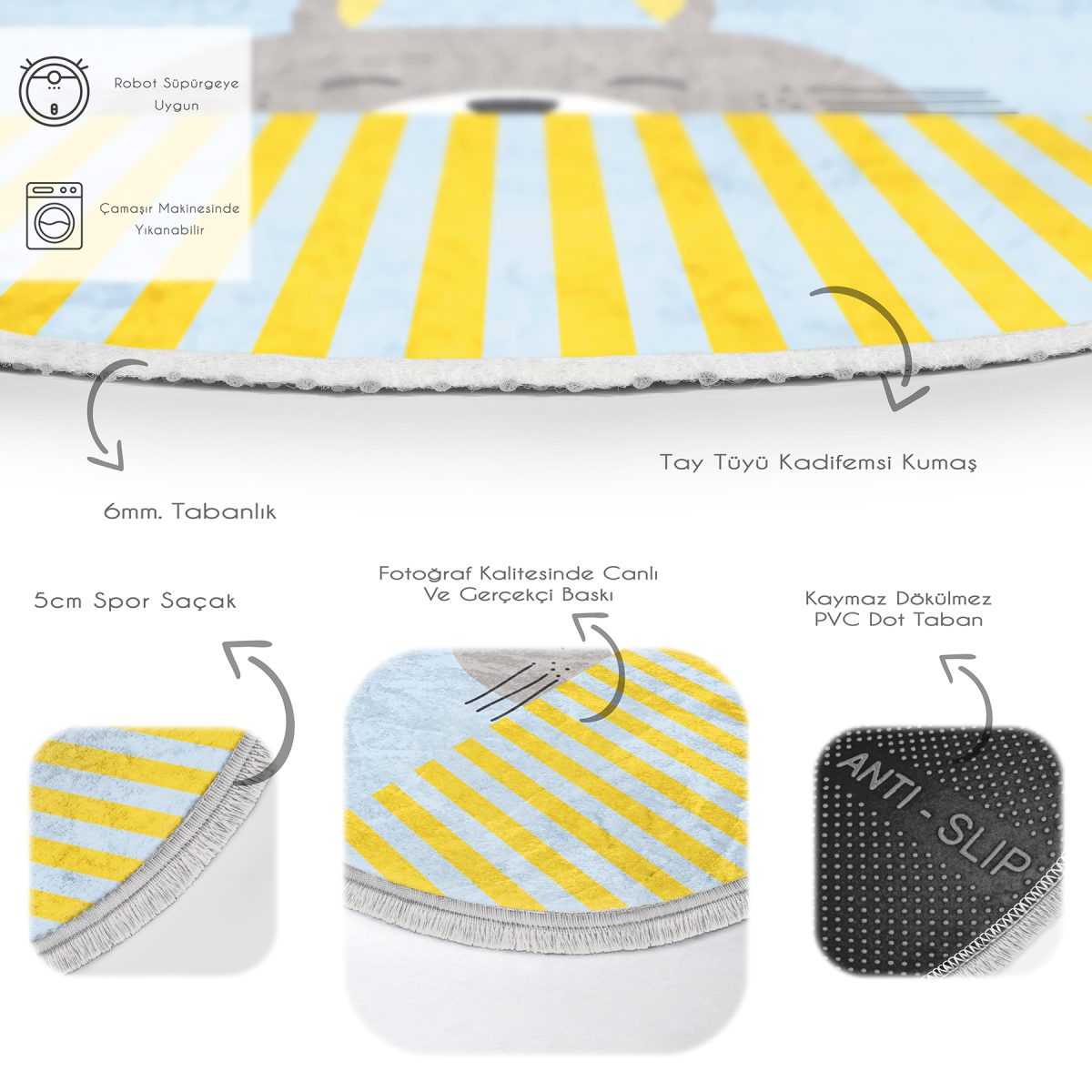Mavi Zeminde Gri Sarı Ayıcık Motifli Çocuk & Genç Odası Makinede Yıkanabilir Kaymaz Tabanlı Püsküllü Yuvarlak Çocuk Halısı
