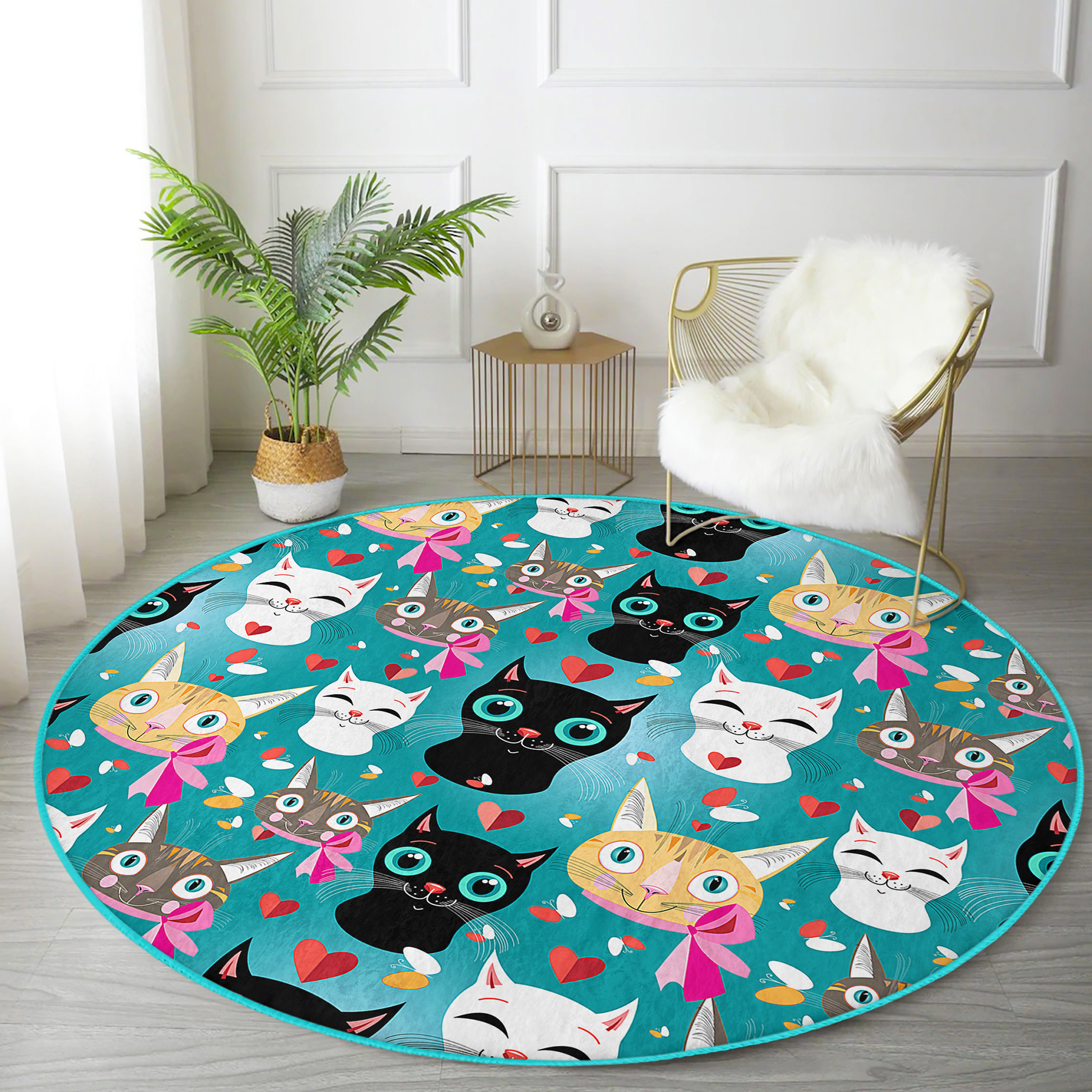 Mavi Zeminde Kedicikler Özel Tasarım Modern Turkuaz Çocuk ve Genç Odası Yıkanabilir Kaymaz Tabanlı Yuvarlak Halı