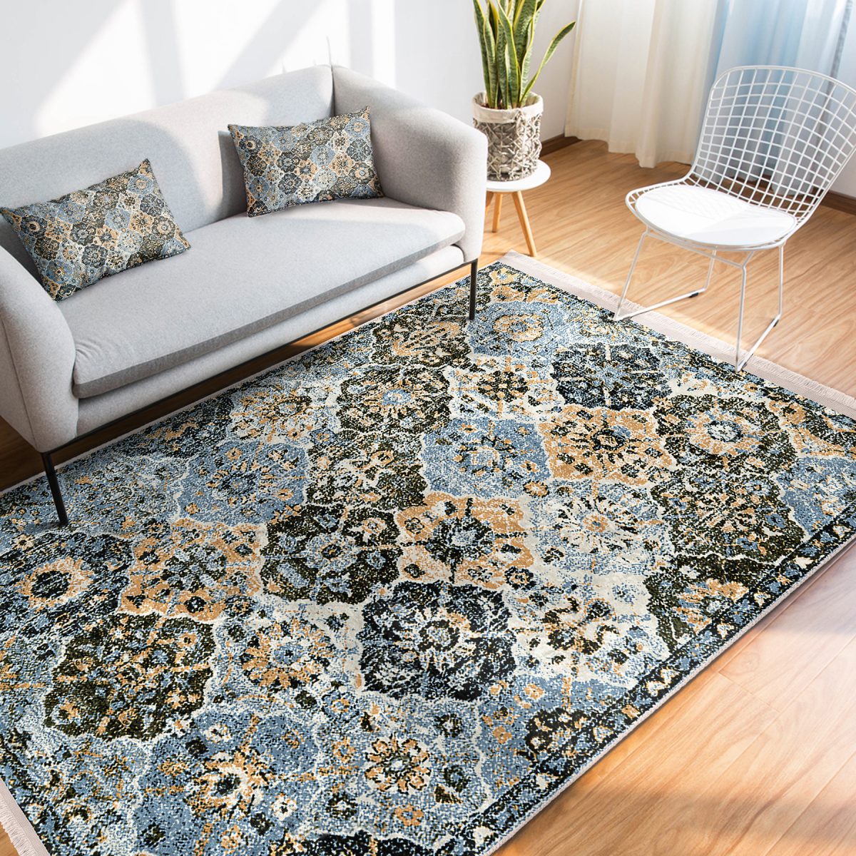 Mavi Zeminde Kilim Motifli Uşak Desenli Vintage Avangarde Salon & Oturma Odası Koridor & Antre Dijital Baskılı Makinede Yıkanabilir Kaymaz Taban Saçaklı Halı